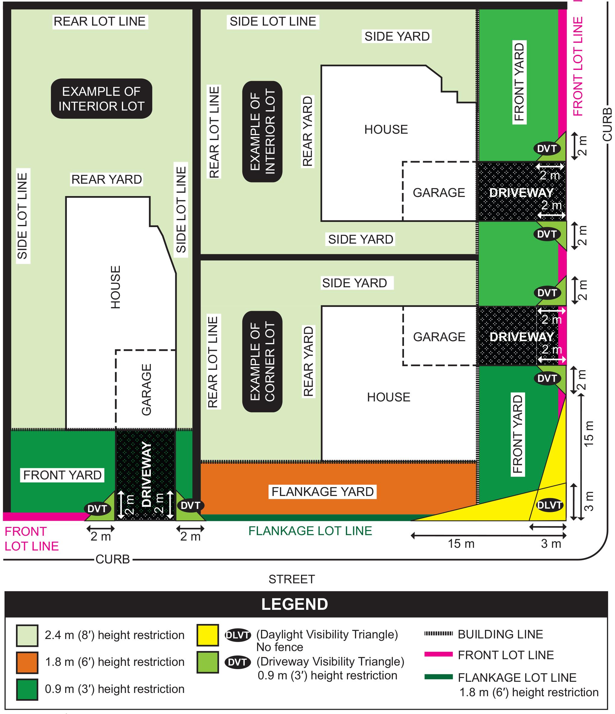 - The triangle between this line and the corner of your lot is the DLVT — no fence is allowed inside it.
