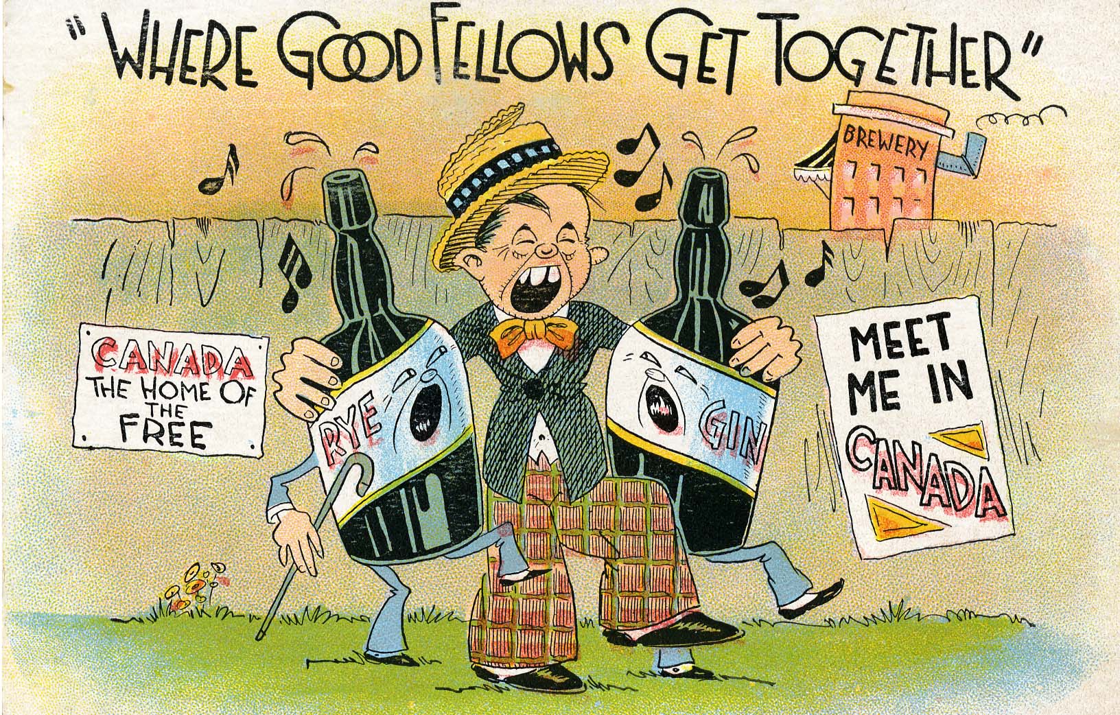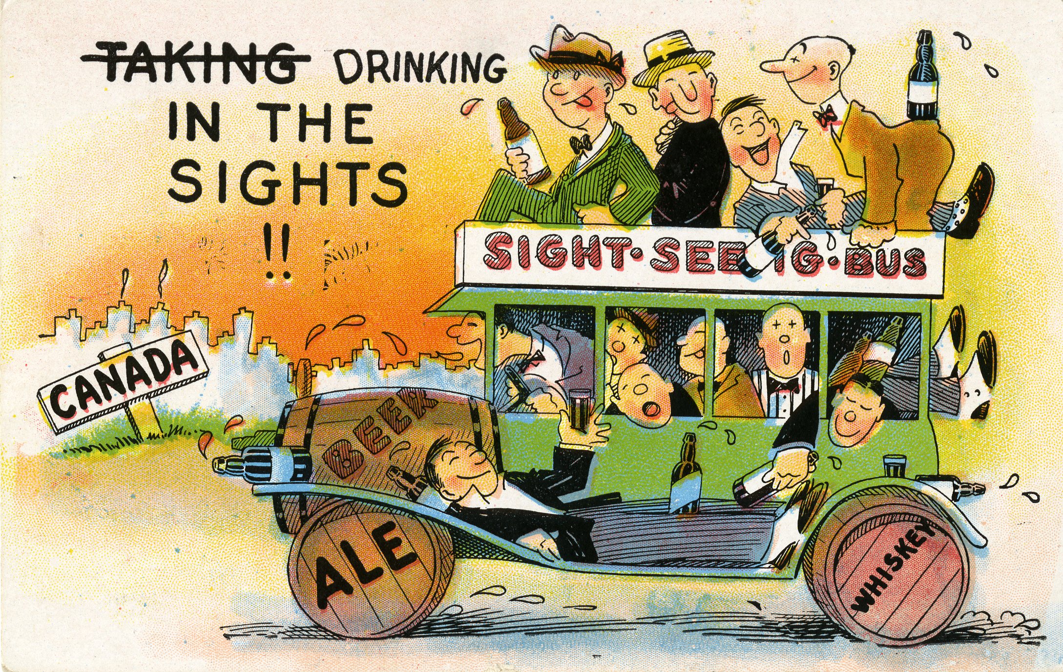 During American prohibition, souvenir postcards were distributed depicting Canada as the barroom of the United States. These postcards were strongly disliked by Canadian temperance groups.