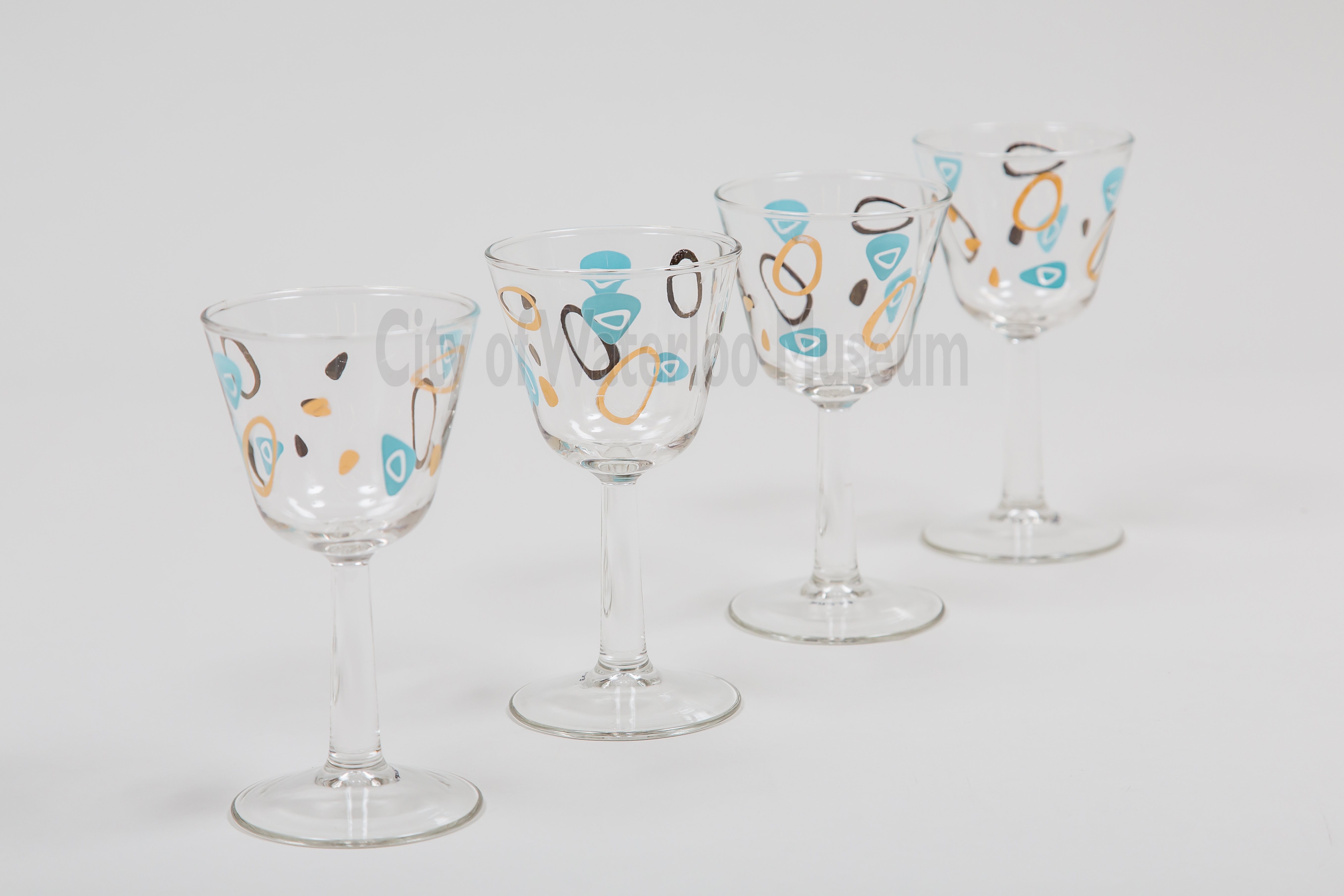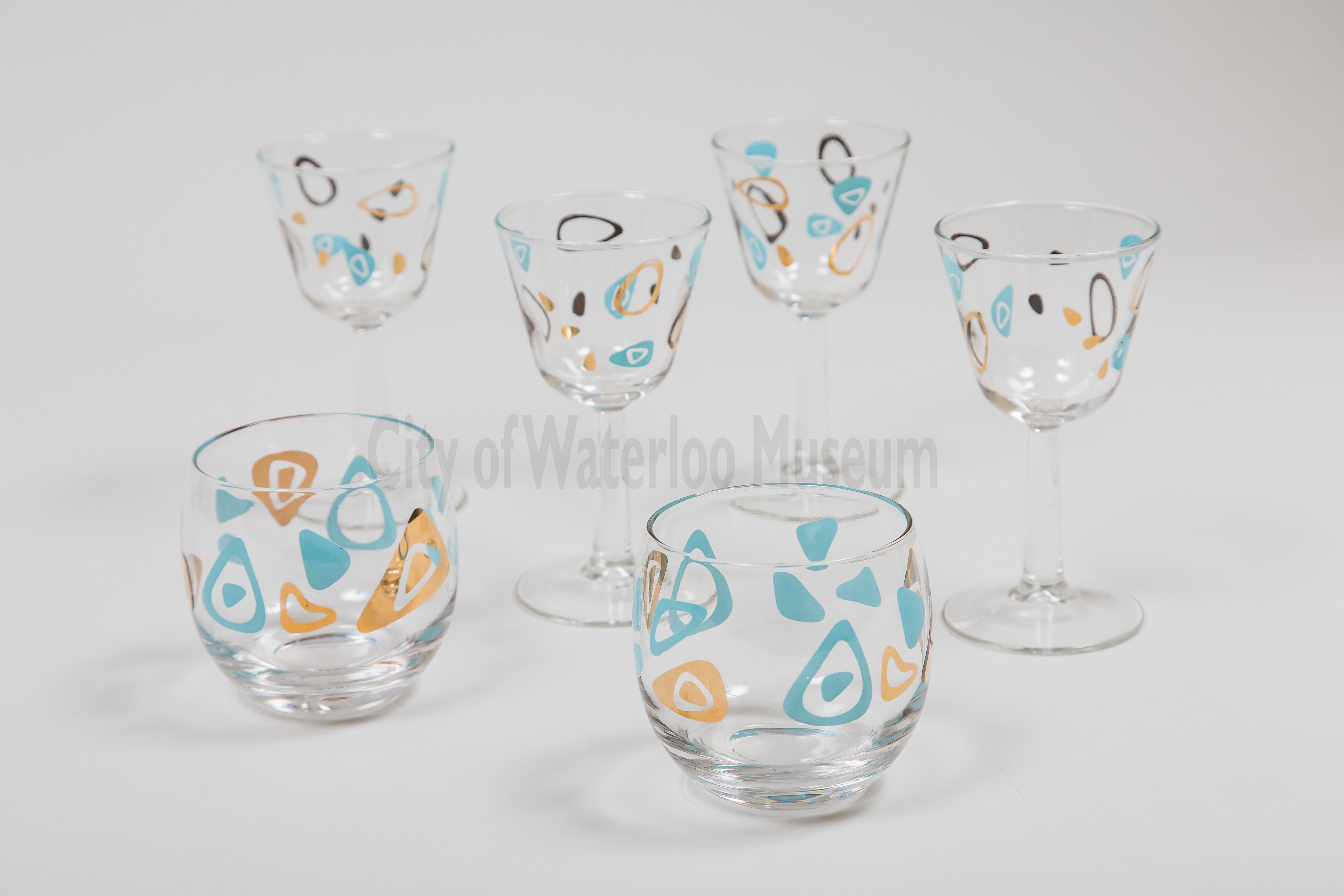 Cocktail culture exploded throughout North America in the 1950s and 1960s. Owning the right cocktail glassware was essential for every host. The basic set contains three types of glasses โ rock tumblers, highball, and cocktail. The mid-century amoeba or boomerang pattern was a classic 1950s atomic era design. This glassware set was part of a local gas station promotion. Returning customers could collect an entire glassware set just by filling up their cars with gasoline.