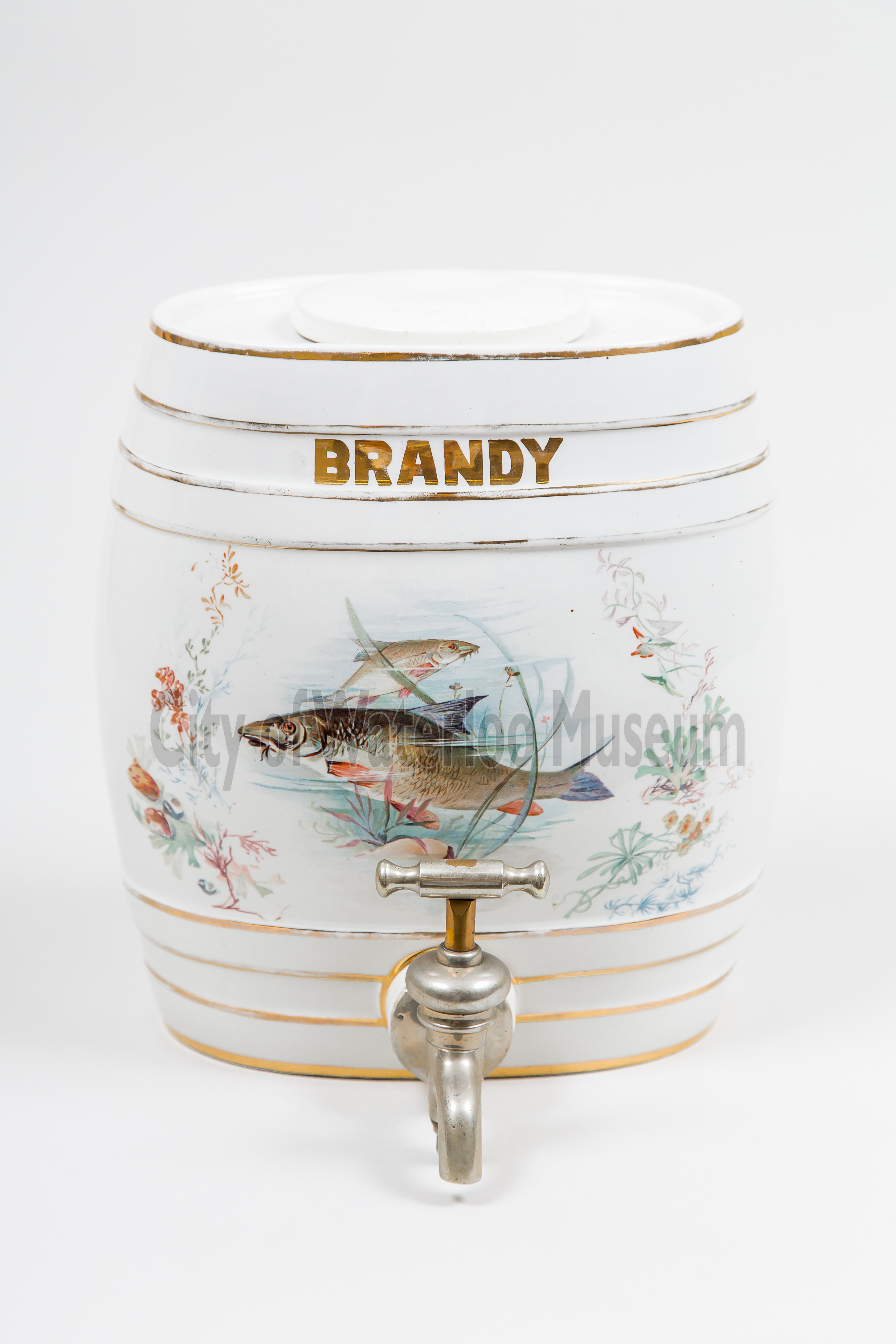 A transfer print scene of two common barbell fish swimming in reeds, eight gilt bands, and the word BRANDY in gold lettering decorate the porcelain spirit barrel.