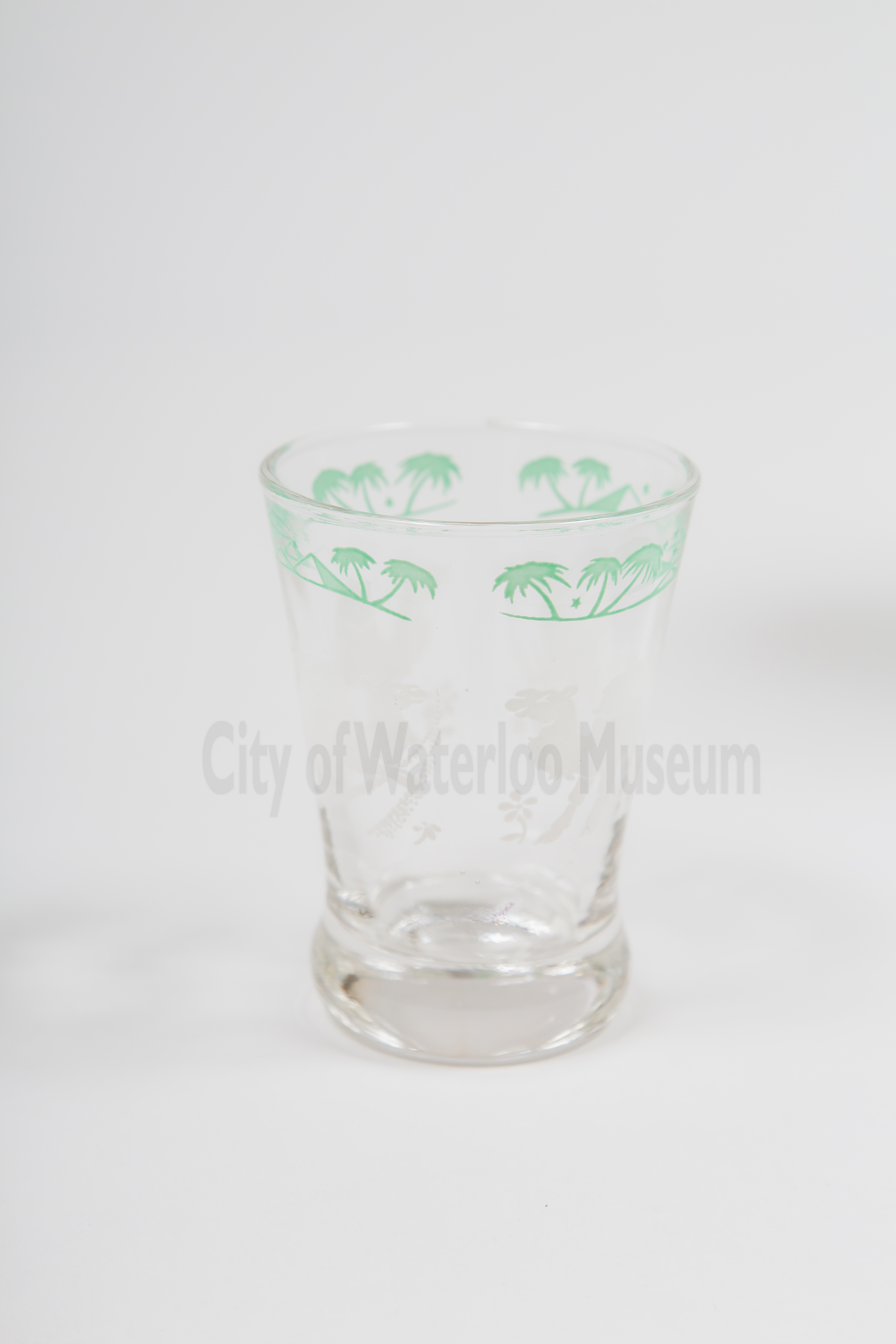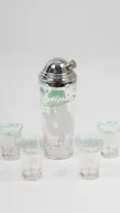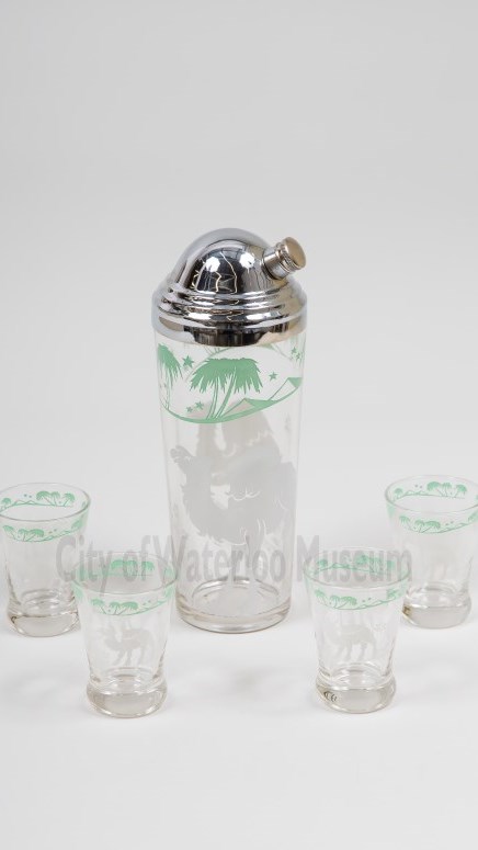 This set was purchased as a wedding gift for a very lucky bride and groom. A silk-screened camel and palm tree design decorate the chrome-topped shaker and six matching cocktail cups.