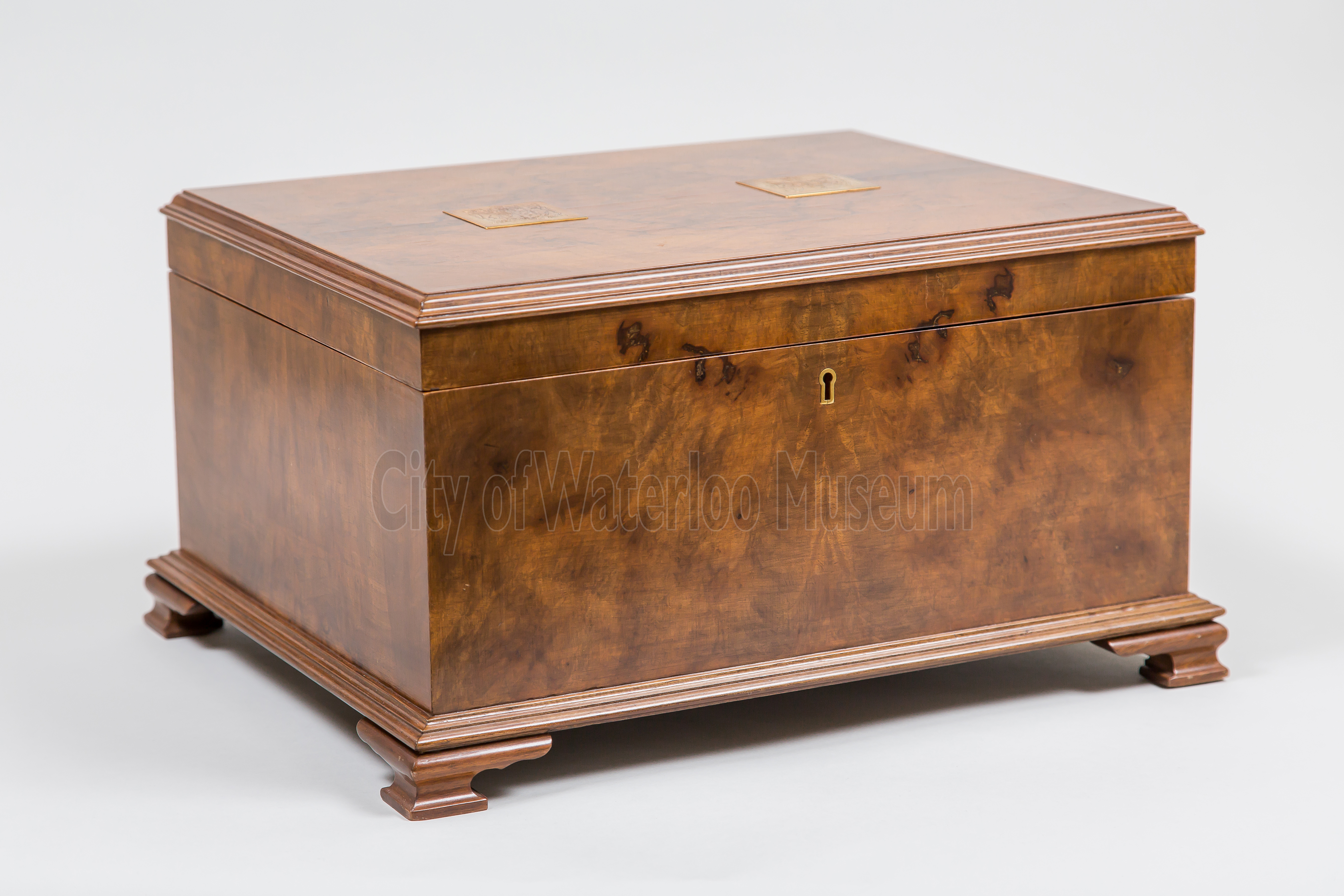 In honour of the Coronation of Queen Elizabeth II in 1953, Distillers Corporation-Seagrams Limited and Chivas Brothers Limited jointly presented Her Majesty with bottles of Crown Royal and Royal Salute whisky housed in a presentation chest. Additional commemorative chests, such as this one, were produced as gifts for company officials. This chest belonged to Samuel Bronfman, President of the Seagram company and the man responsible for creating Crown Royal Whisky.