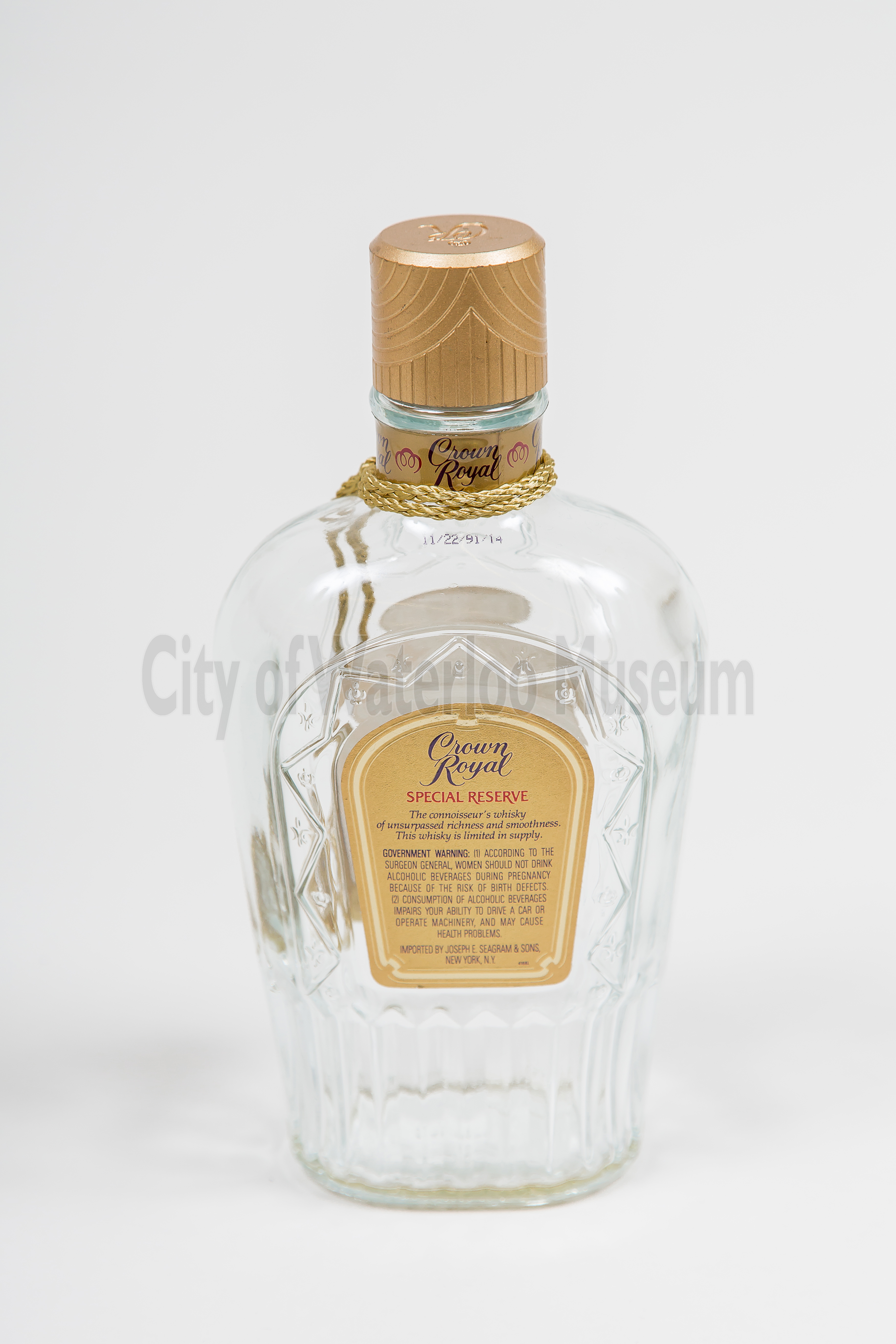 Crown Royal Special Reserve was first released in 1992. The Whisky was blended from specifically selected barrels containing unique characteristics and was allowed to age longer than average to produce a more specialized flavour. This Crown Royal Special Reserve bottle is part of the 1st edition, which ran from 1992 to 1999. The bottle is stamped with a November 22nd, 1991, production date, meaning it was part of the initial production run before Seagram released the brand to the public. The 2nd edition ran between 2000 and 2007 and featured purple crowns on the bottle cap.
