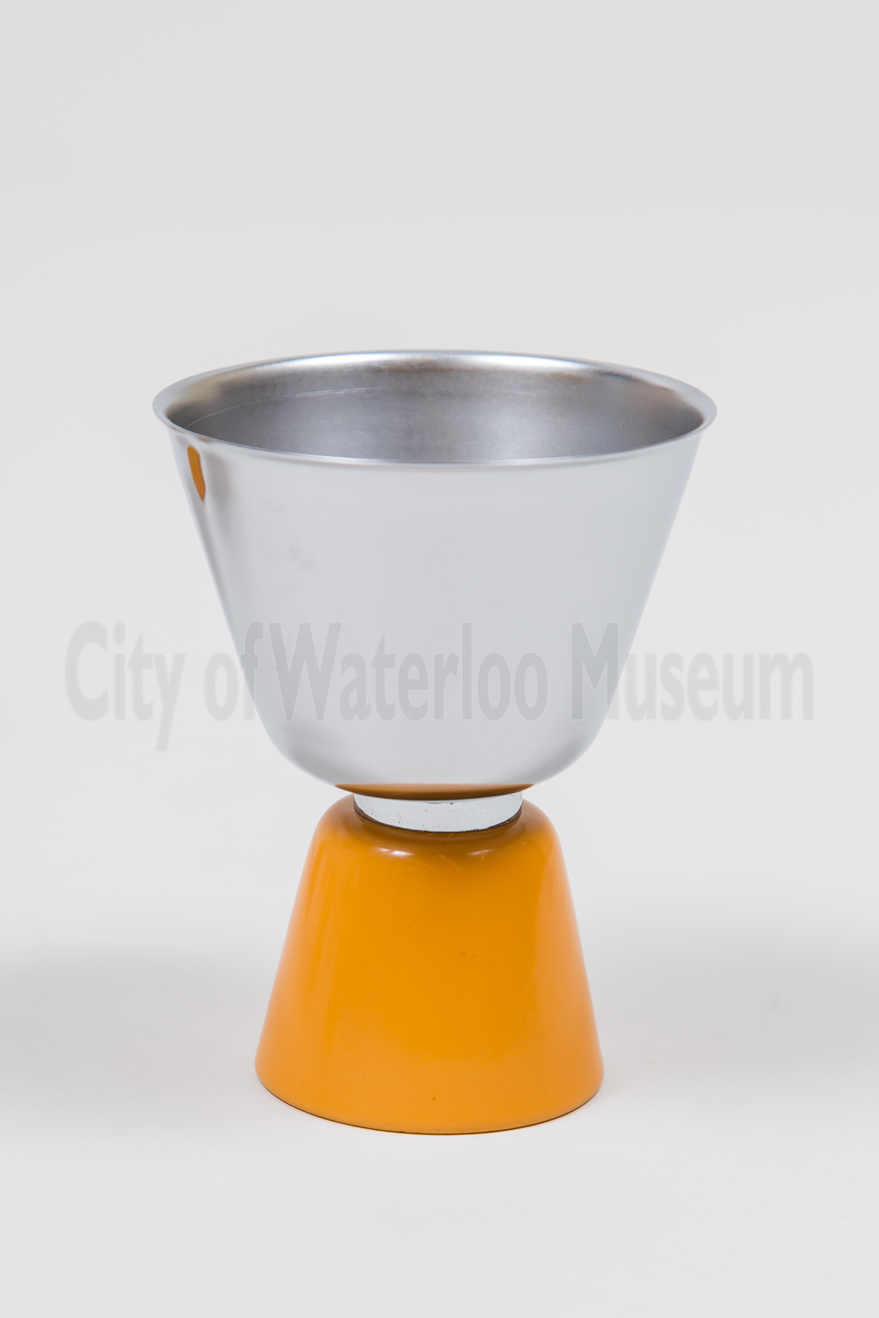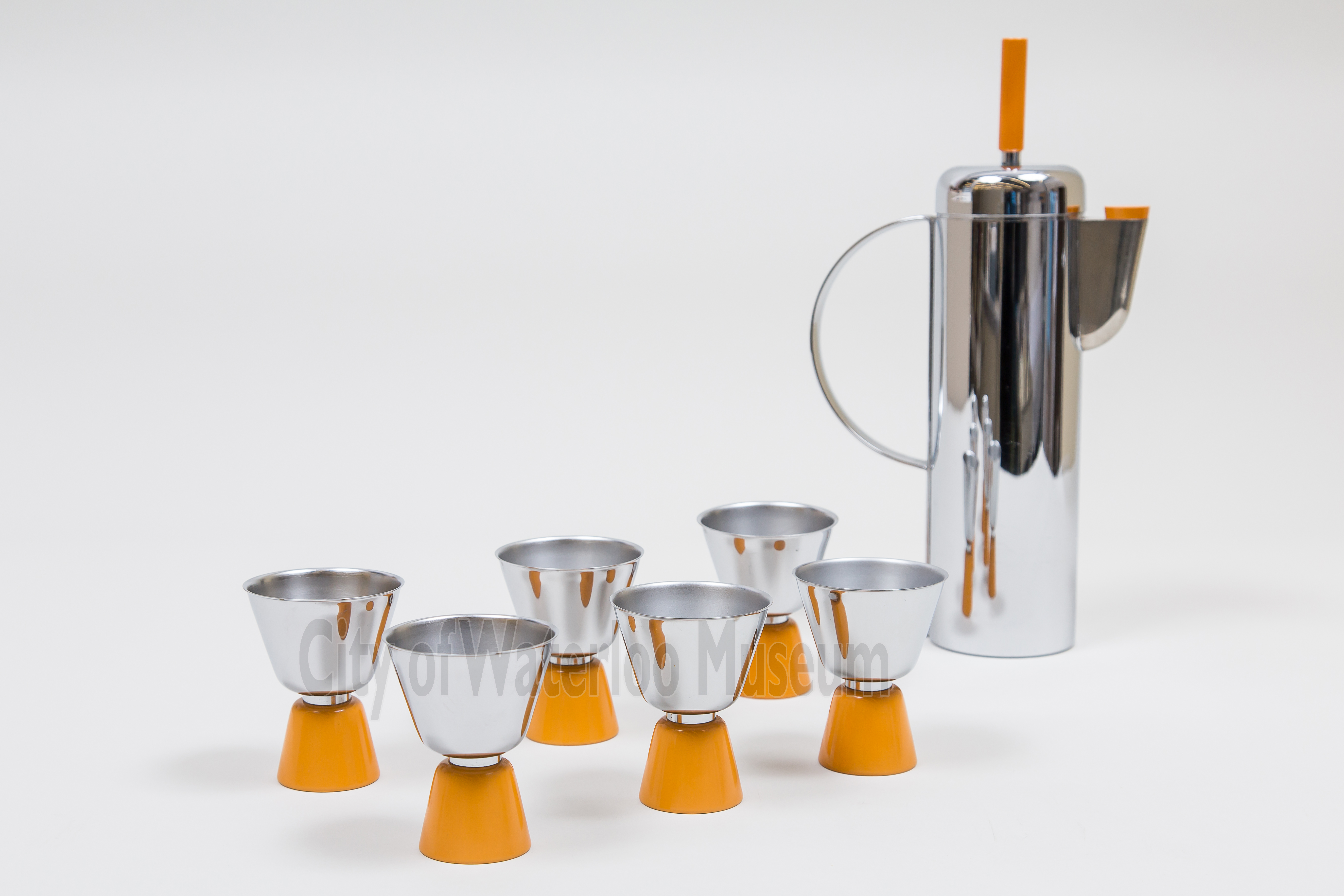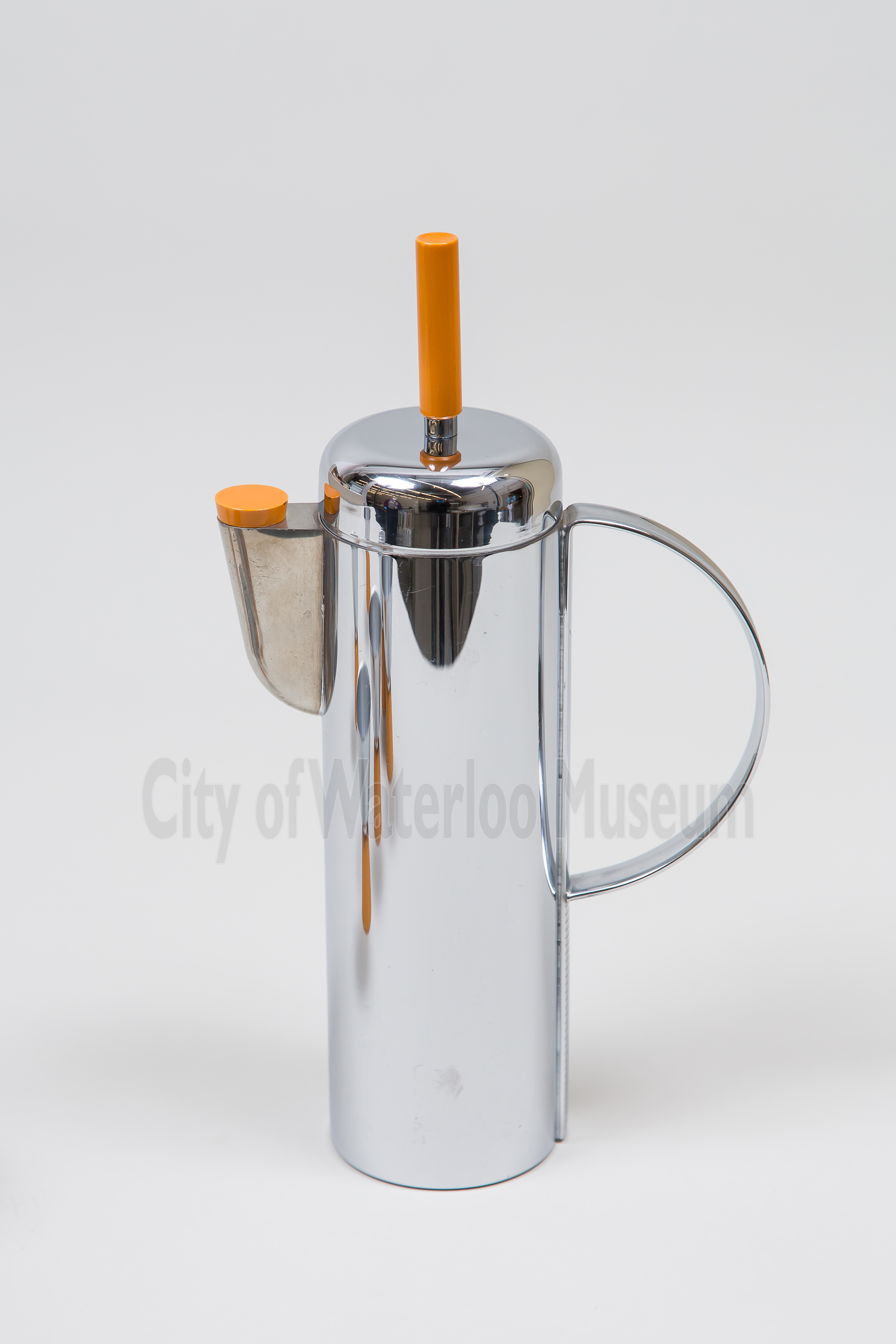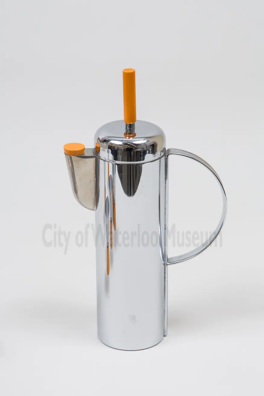 This striking polished chrome cocktail shaker with Catalin trim was part of the New York skyscraper series. This series was designed by William Archibald Welden, director of design for Revere Copper and Brass Company. The Catalin trim, a plastic resin, was originally white in colour. Sunlight causes the plastic to yellow over time.