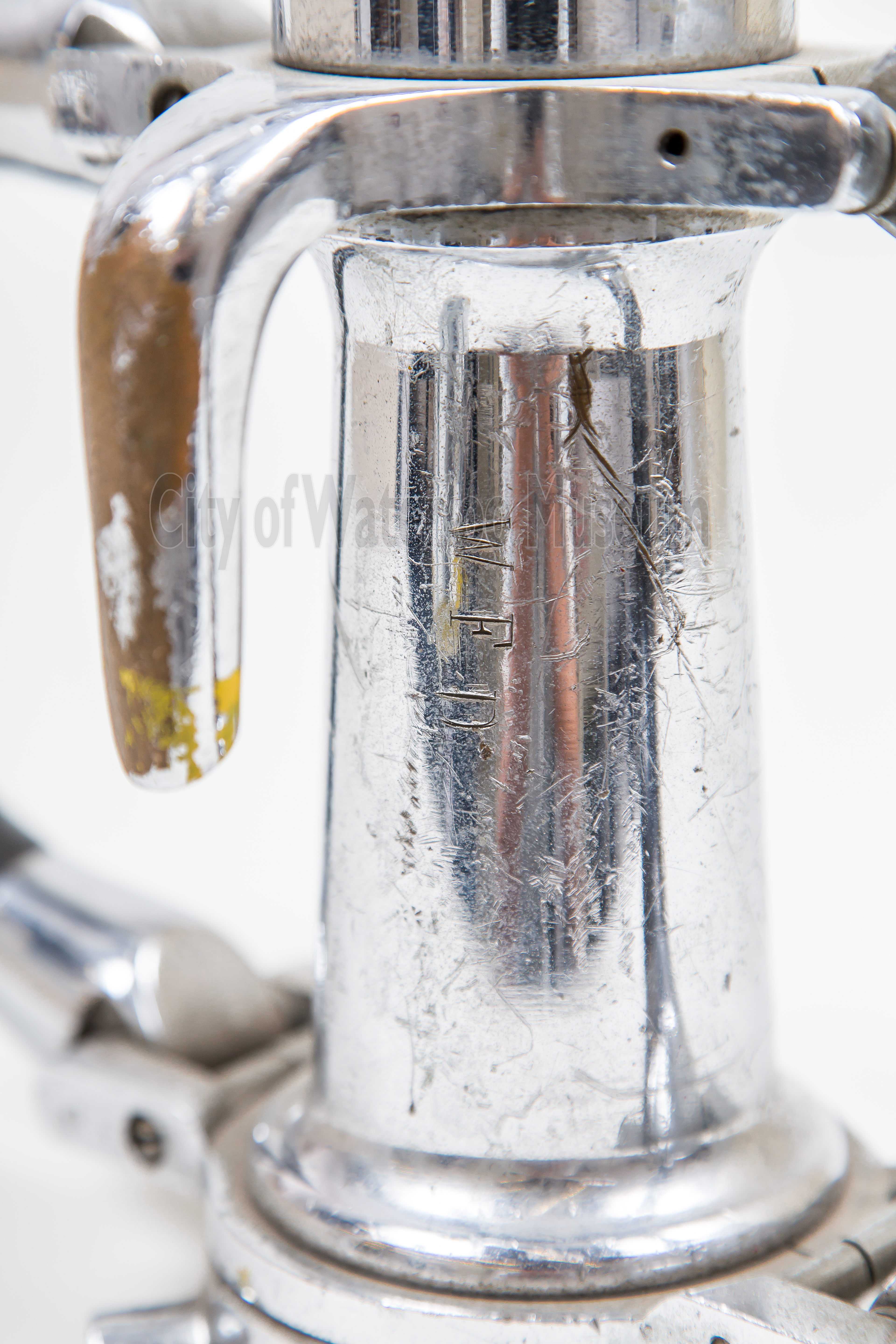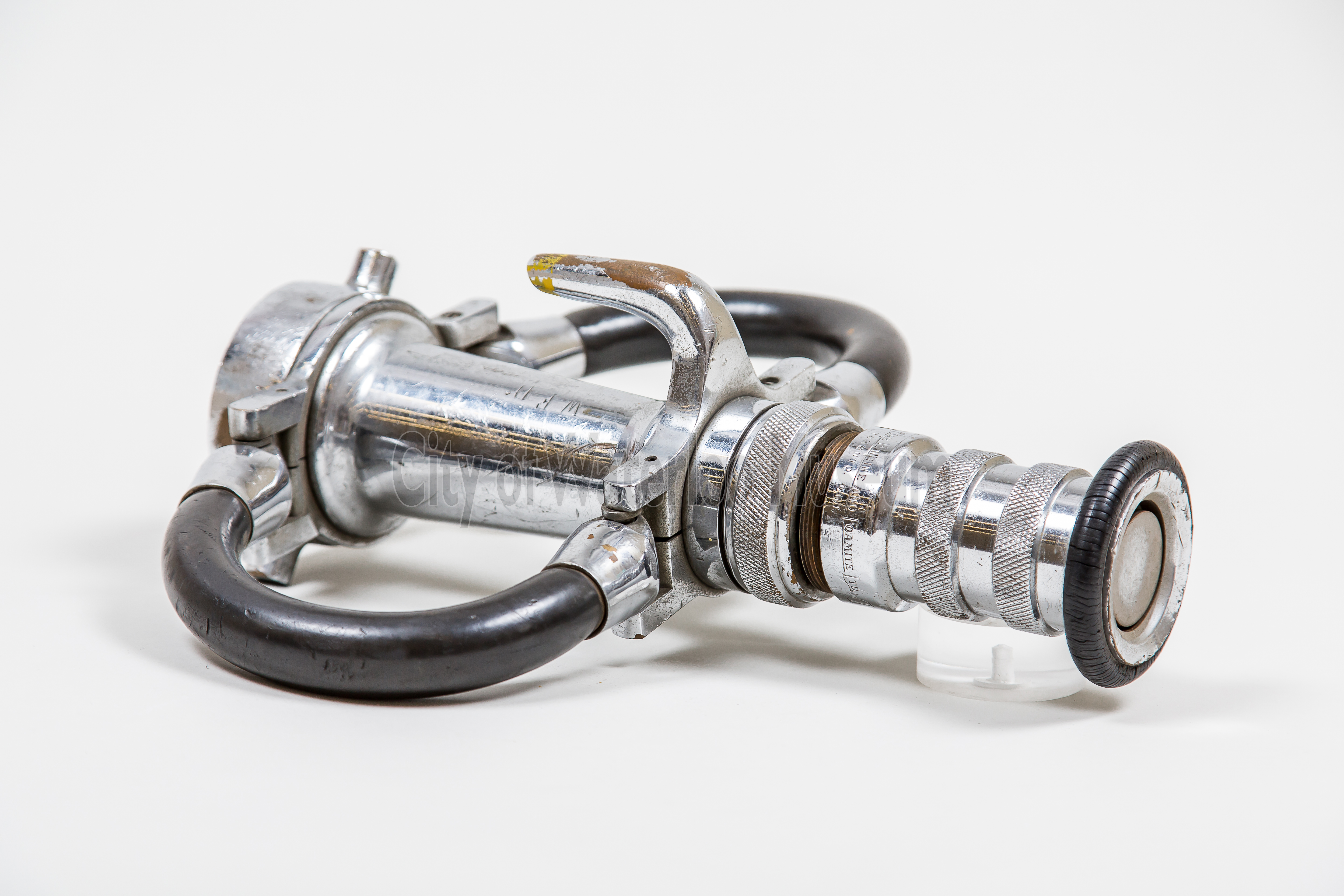 Here’s a nifty fire fighting invention. A fog nozzle works by breaking up the water flowing through it into tiny water droplets. These broken up droplets create more surface area than a solid stream of water. The droplets absorb the heat of the fire, turn into steam, and displace the oxygen. With no oxygen, the fire is smothered and quickly extinguished. The Fog Nozzle Company in the U.S.A. manufactured this unique piece of firefighting equipment used by the Waterloo Fire Department.