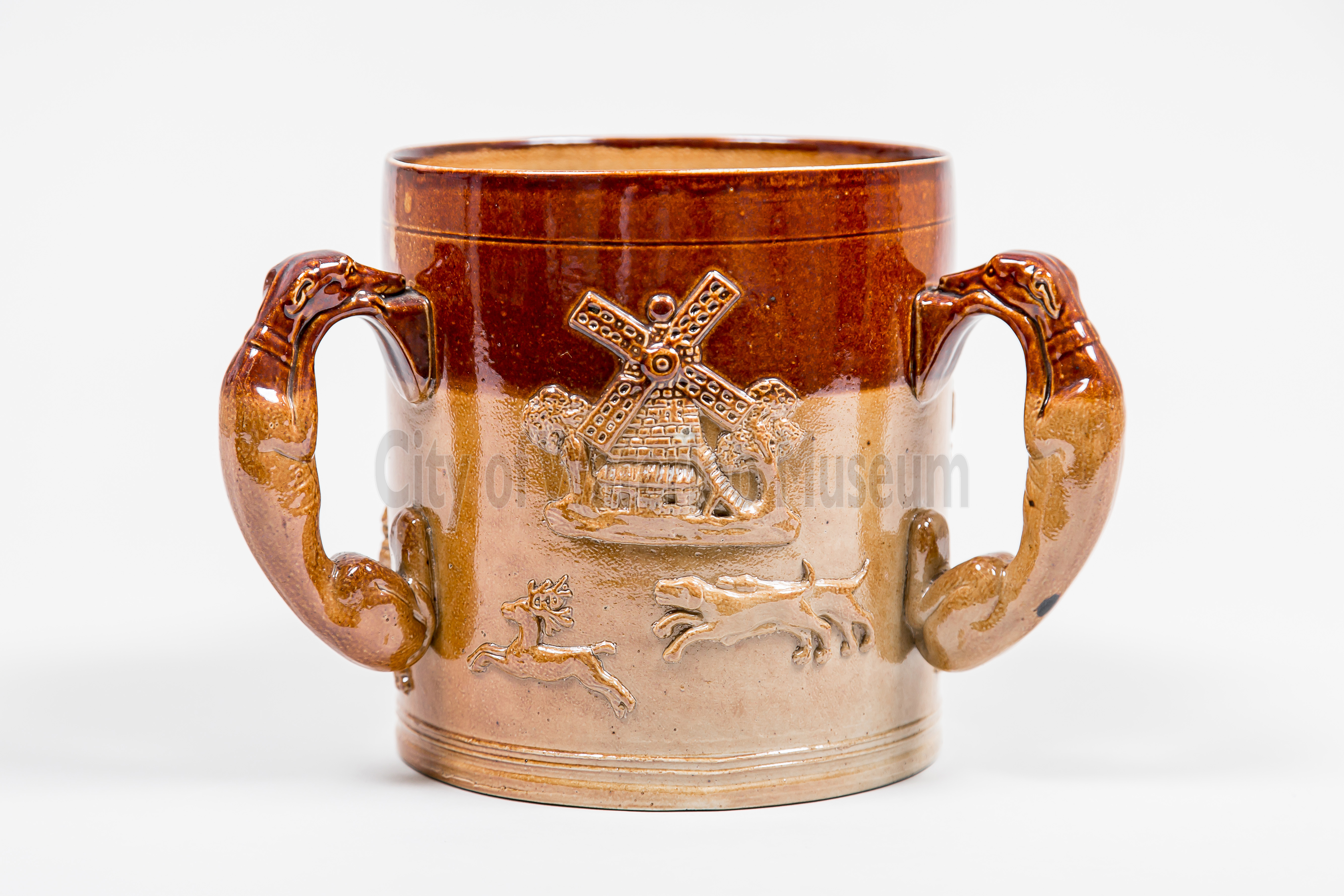 This three-handled stoneware cup is covered with moulded and applied decorations. Circling the bottom of the cup is a hunt scene. A man on horseback and his hunting dogs chase a fleeing deer. Above are three scenes; a windmill, a willow tree, and a man seated at a table drinking. The handles are mould-made in the shape of running dogs. The tan and brown loving cup was made by Royal Doulton of England.