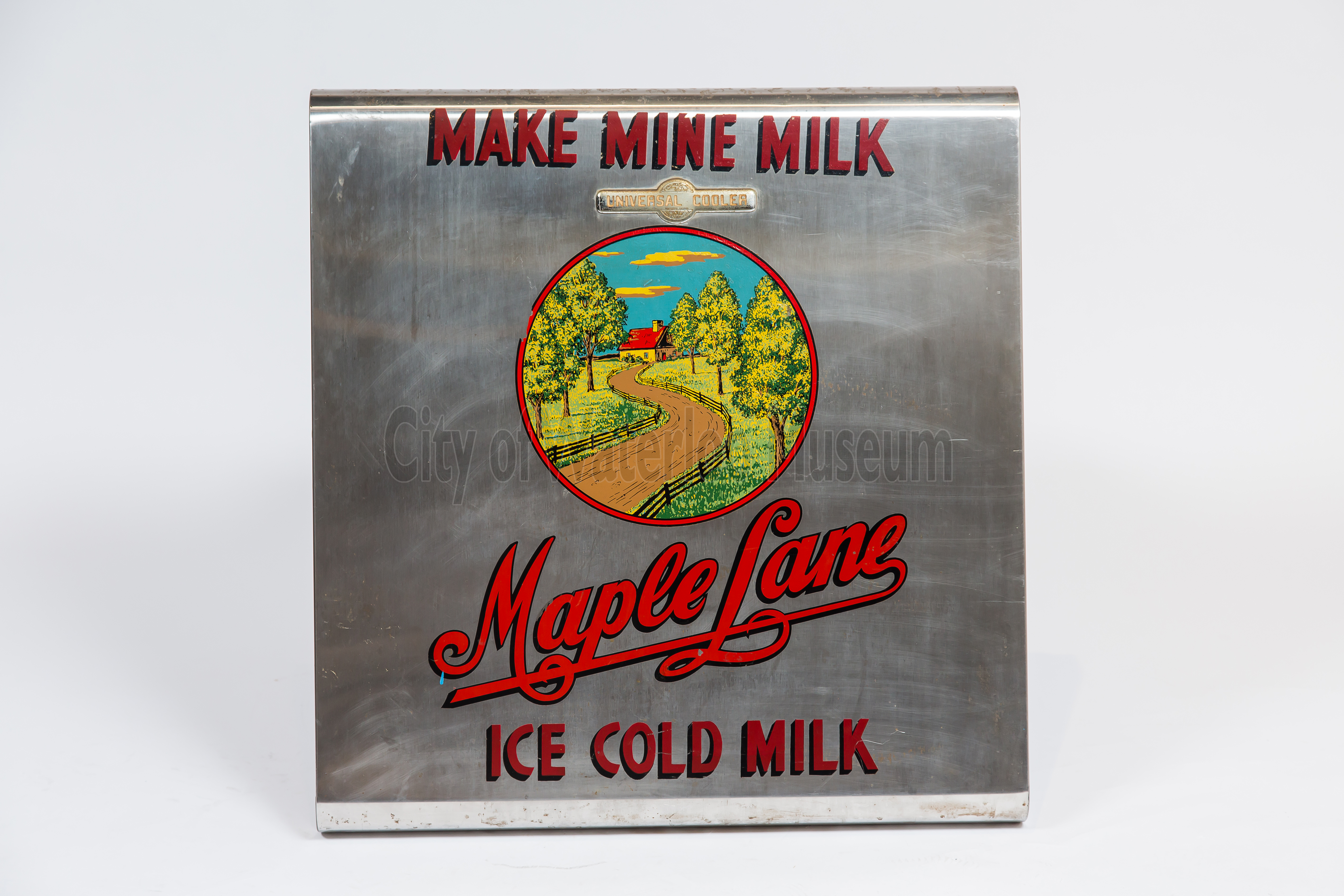 The Maple Lane Dairy name was inspired by the row of maple trees growing along the lane at Oscar Martin’s Waterloo farm. This is the door from an original Maple Lane Dairy milk refrigerator used at the Park Inn (1955) in Waterloo Park. Maple Lane Dairy milkshakes and ice cream were favourite summertime treats for kids young and old.