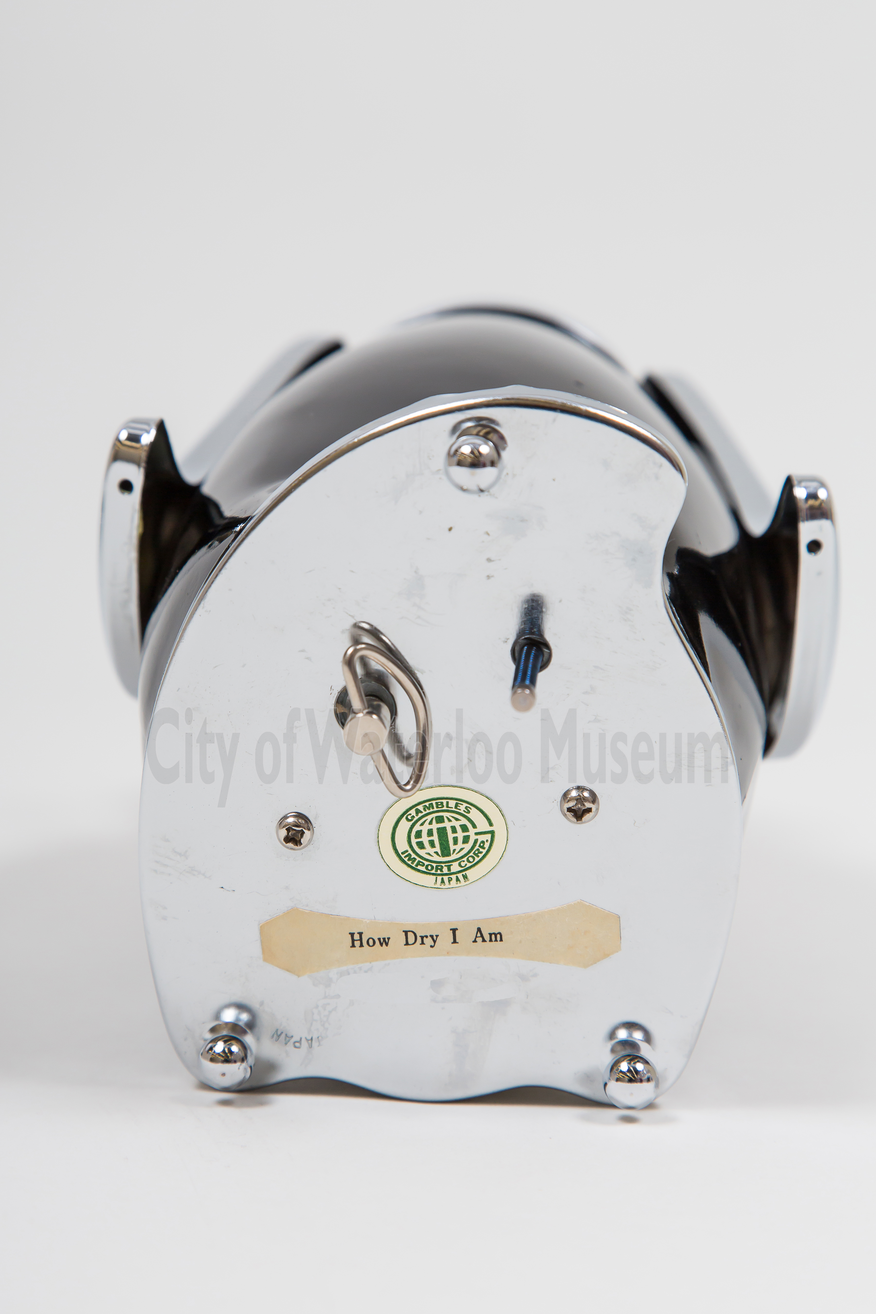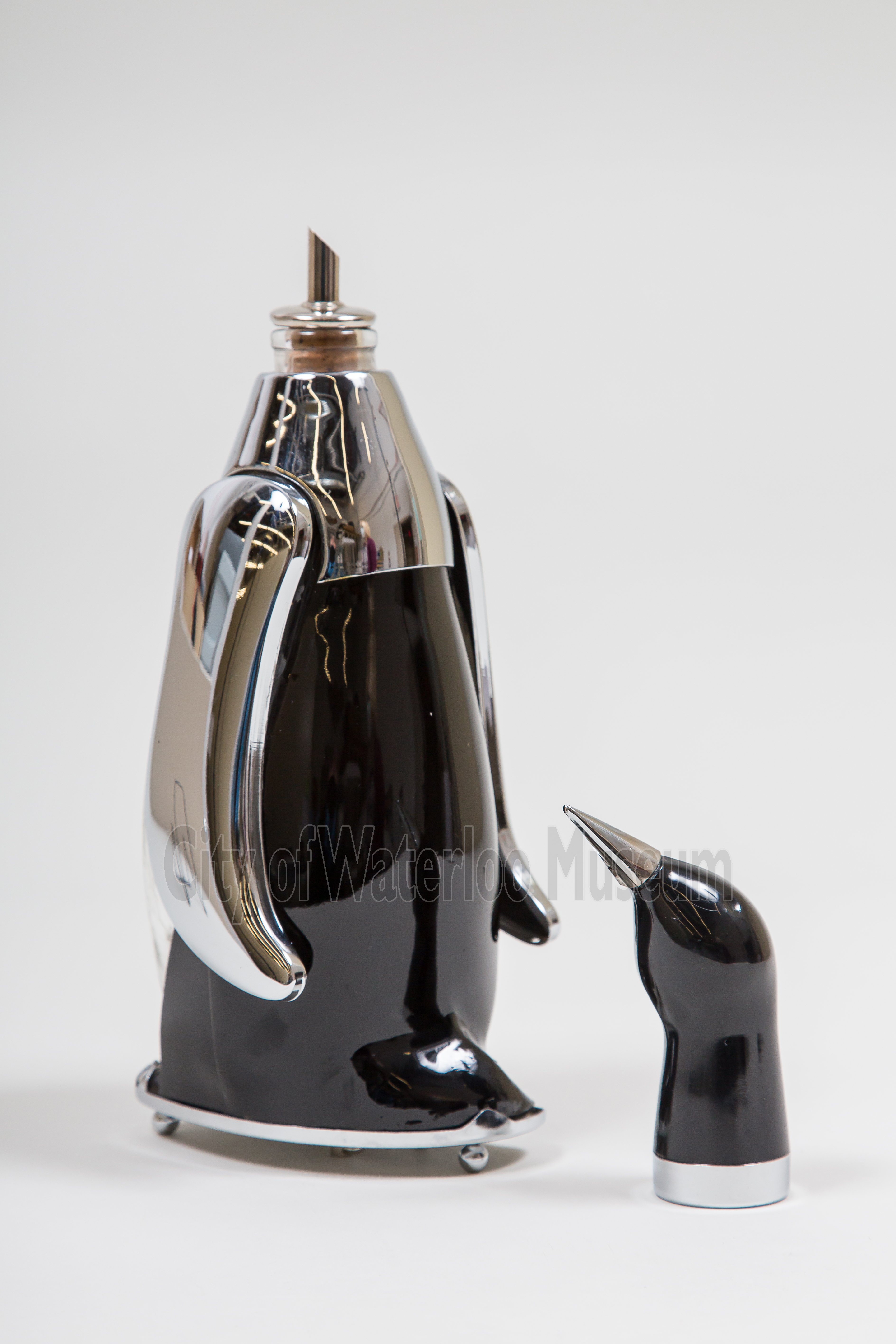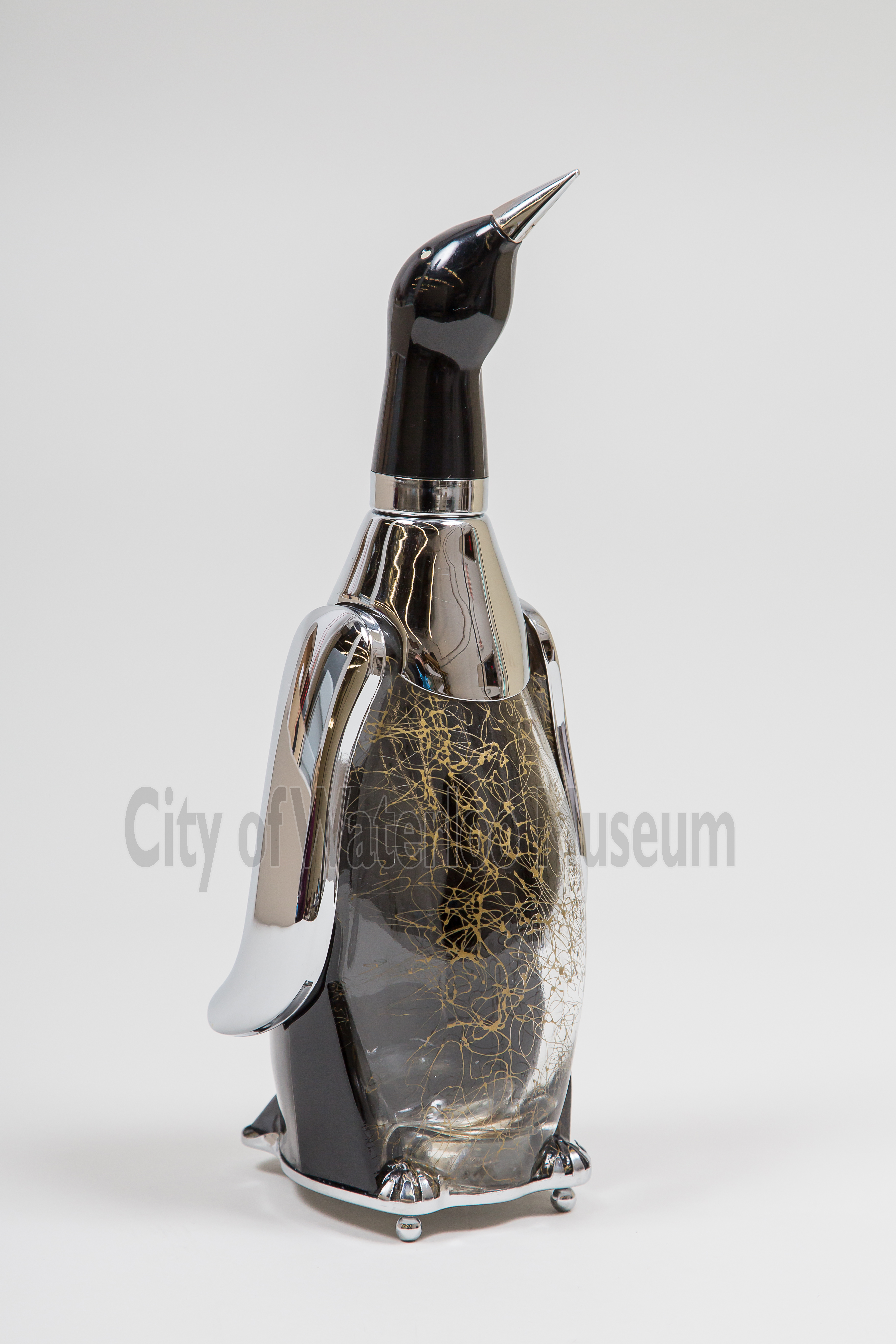 Waddle you have? This charming art deco-style penguin decanter also has a music box hidden in the bottom. What better mascot than a penguin with its elegant natural tuxedo suggesting the good life. Wind it up and each time you pour a drink, the tune “How Dry I Am” plays. The decanter is made of stainless steel, plastic and glass, with gold swirling detailing throughout the glass. The penguin’s head comes off to reveal a chrome-plated cork stopper. Tise mid-century bar decanter was made in Japan and imported to North America for sale.