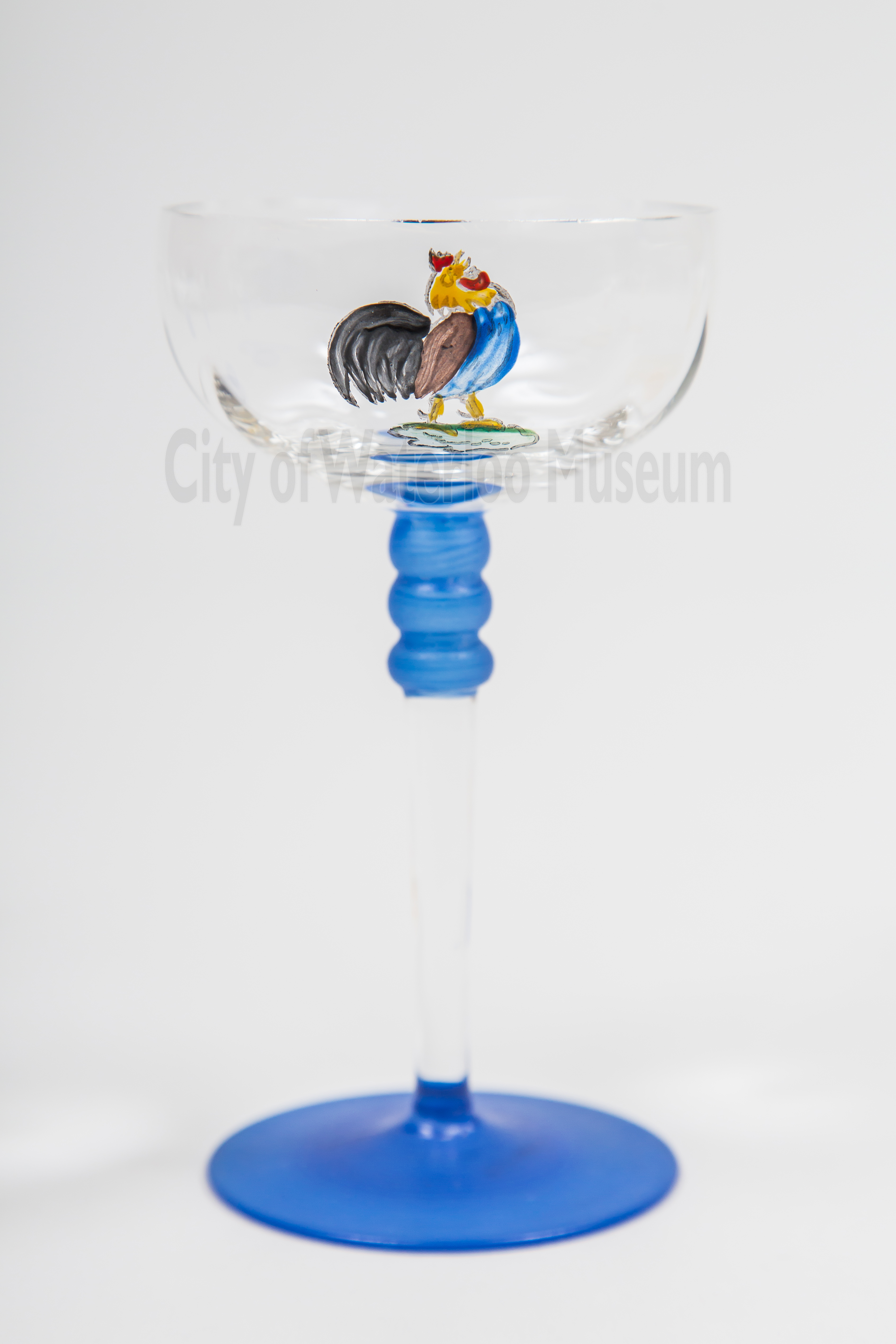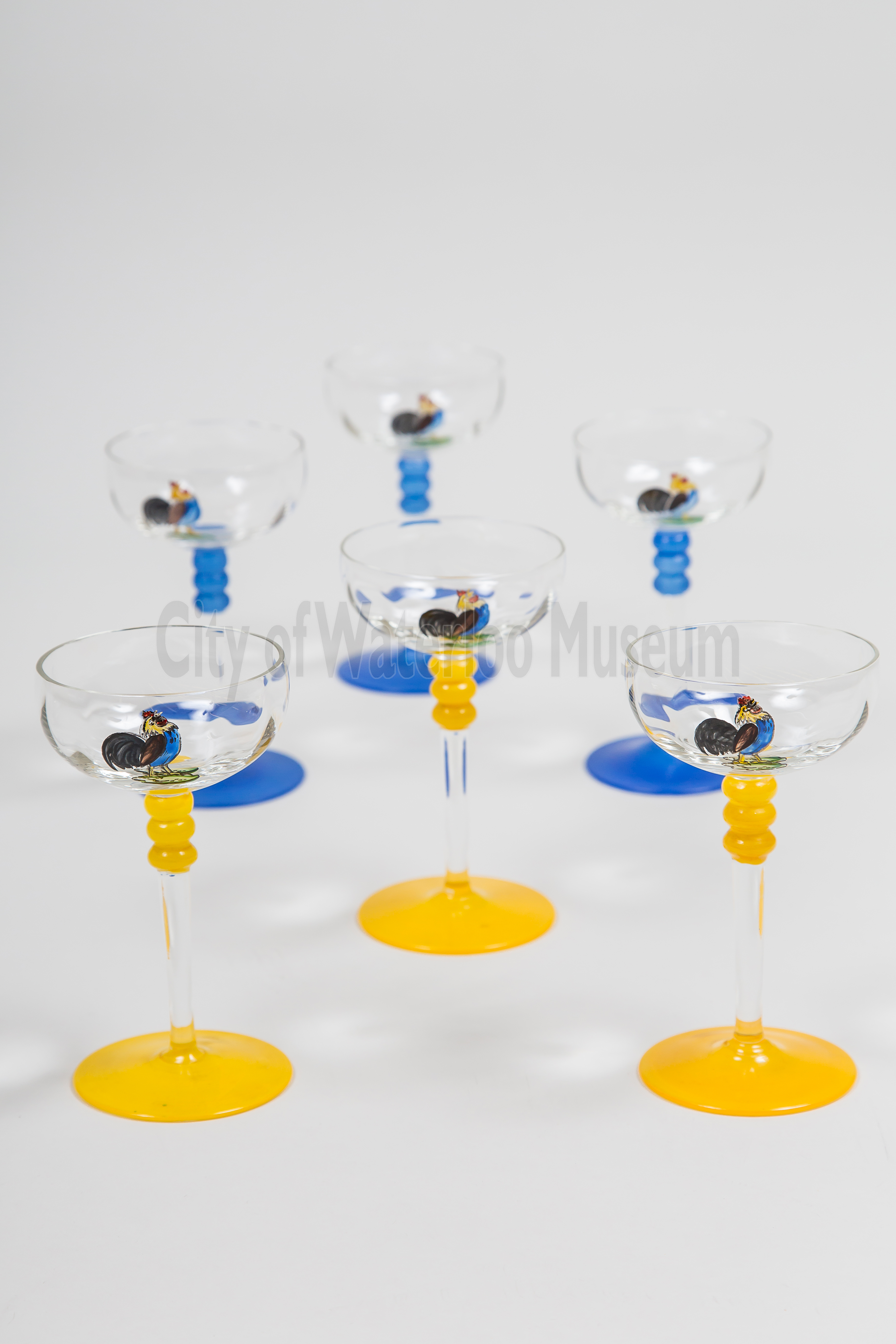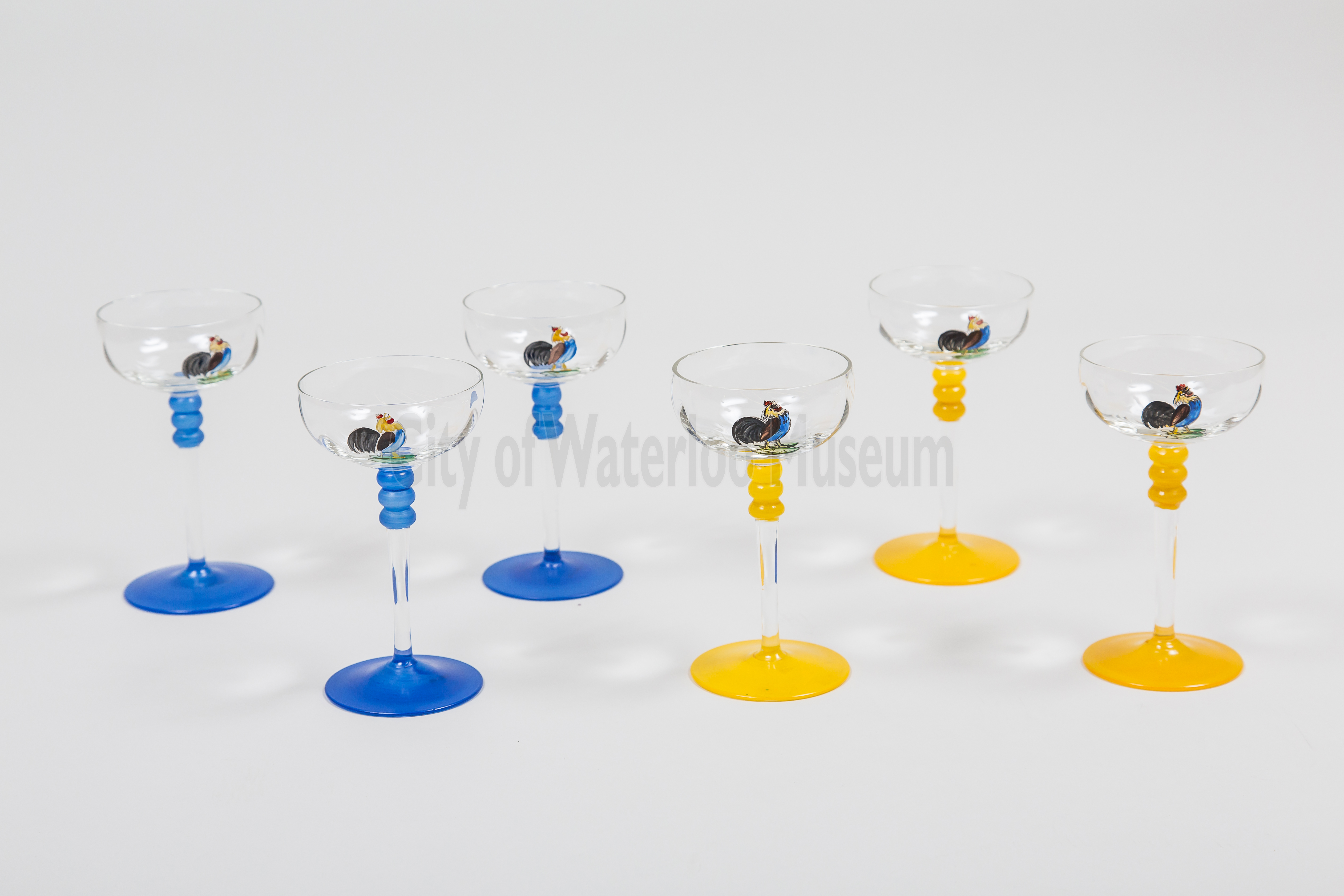 There are many different ideas about how the word “cocktail” came about. One story claims that rooster tail feathers were used as a garnish in North American drinks in the late 18th Century. The tail feather garnish became the inspiration for the name “cocktail”. Is the story true? There doesn’t seem to be much evidence to suggest it is, but that didn’t stop rooster decorations from appearing on glasses and barware. These colourful Art Deco cocktail glasses are adorned with a fun transfer print of a rooster with its big tail of feathers.