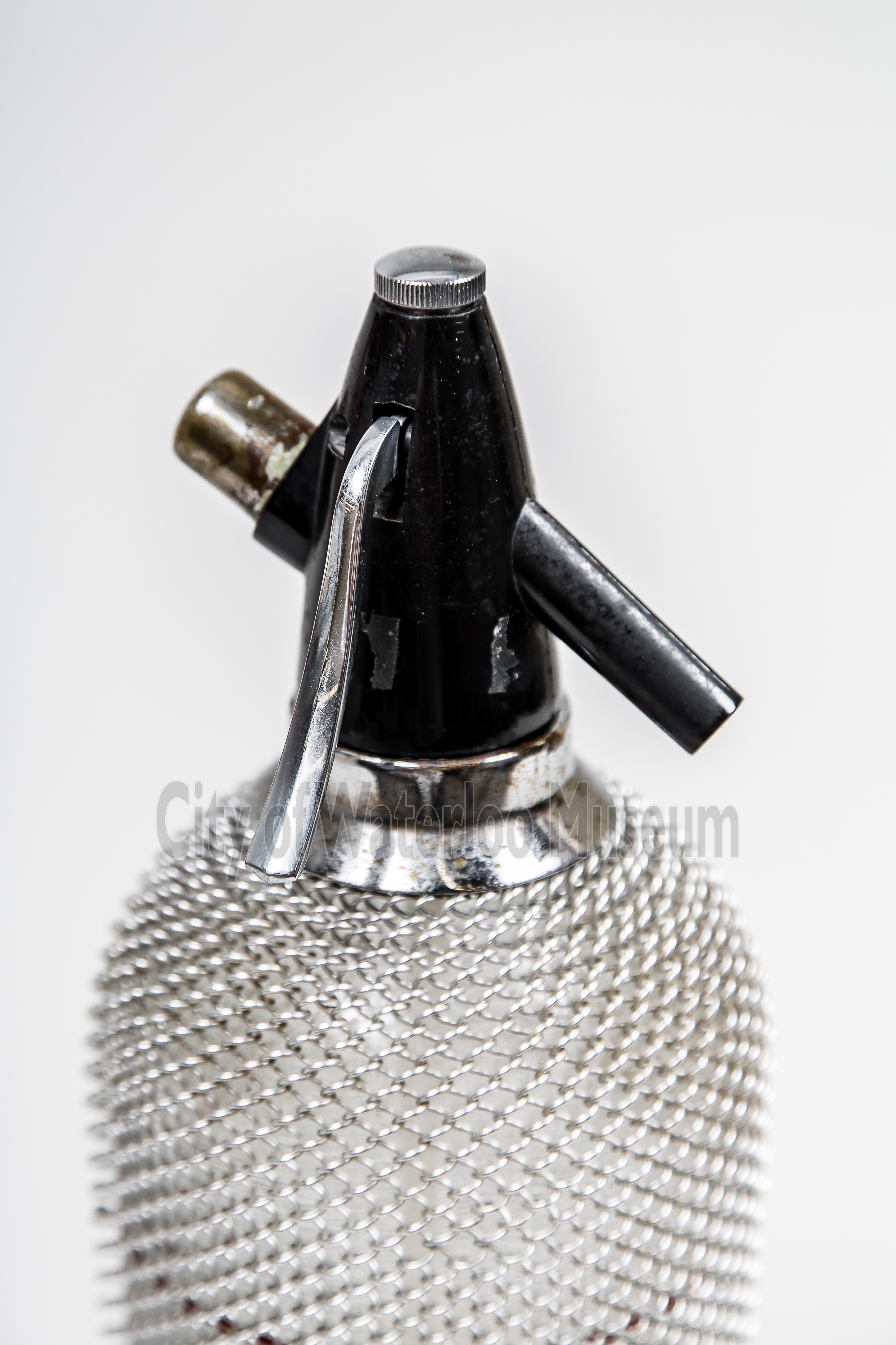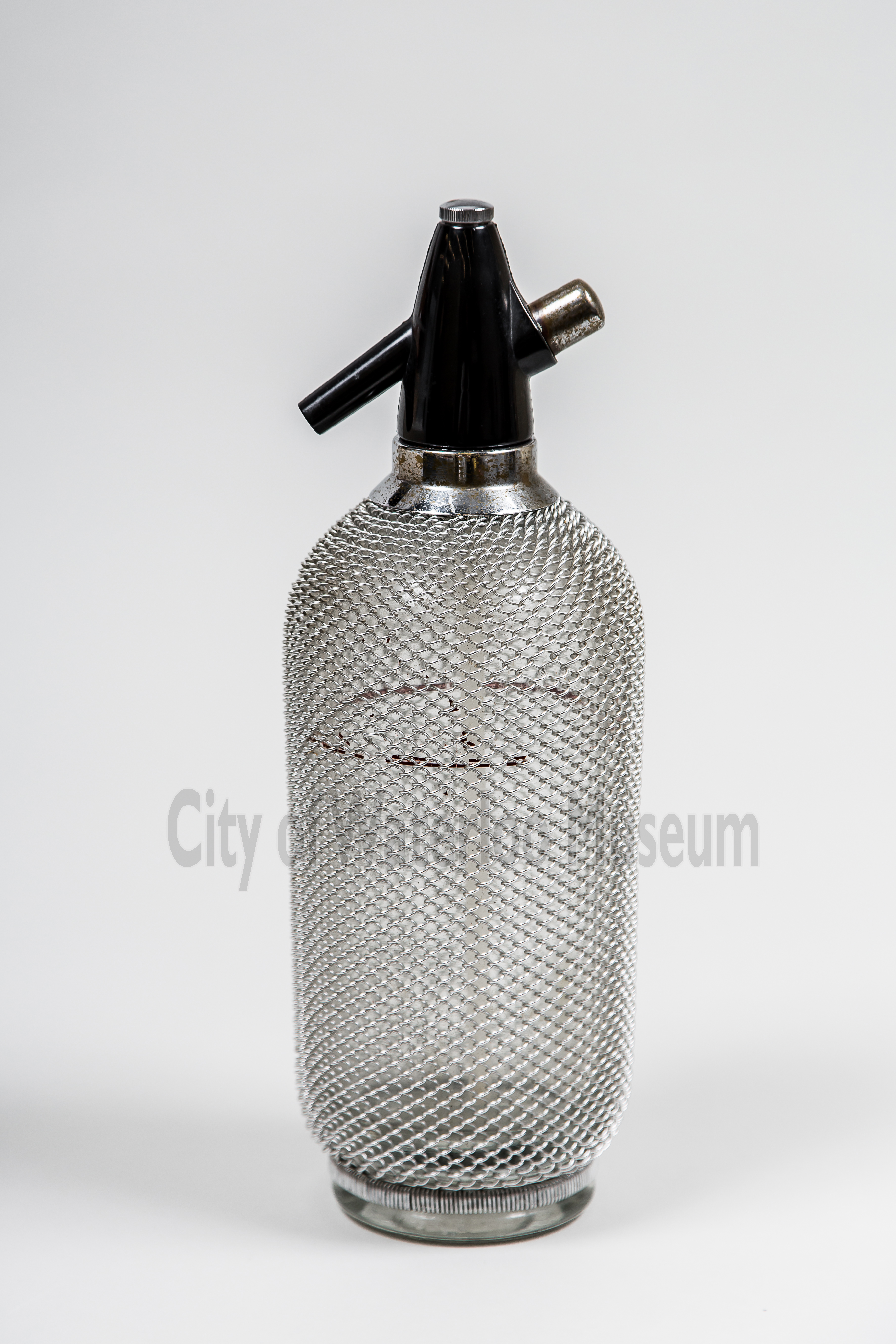 A seltzer siphon is a must-have piece for any bar. Also known as a soda siphon, the bottle stores carbonated water, keeping it from going flat. Seltzer siphons were very popular in the 1920s and 1930s, but with the invention of bottled carbonated beverages, they fell out of use. Made by the American Cut Crystal Corporation (ACC) in New York, the crystal glass bottle was made in Czechoslovakia. Decorative chainmail protects the imported high quality glass. The bright red line shows the bartender how much water to add. A pressurized carbon dioxide cartridge screws on to the back of the black plastic cap piercing the cartridge and releasing the gas into the water. Pull the trigger and out of the spout shoots freshly made seltzer water to add to your drinks.