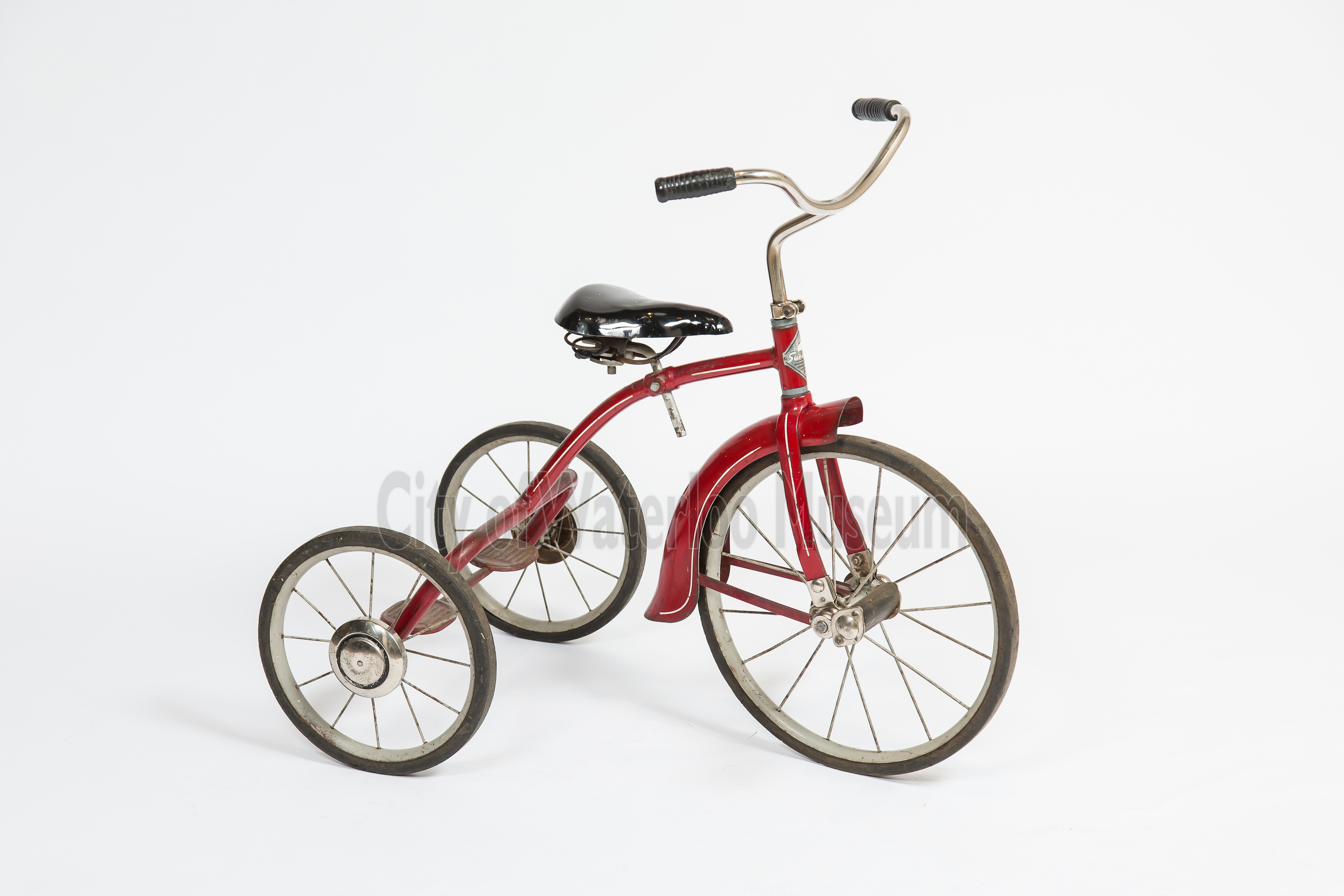 What 1950s kid wouldn’t love pedaling around on this flashy Sunshine Streamline tricycle? Fire-chief red frame, shiny wheels, blue leatherette seat, and a step plate for your friend to ride on the back. The perfect ride! Between 1946 and 1954, the Sunshine Waterloo Company offered a large range of kid and adult bikes. They ranged from tricycles and 3-speed racers to sidewalk bikes and whitewall balloon tire bikes.