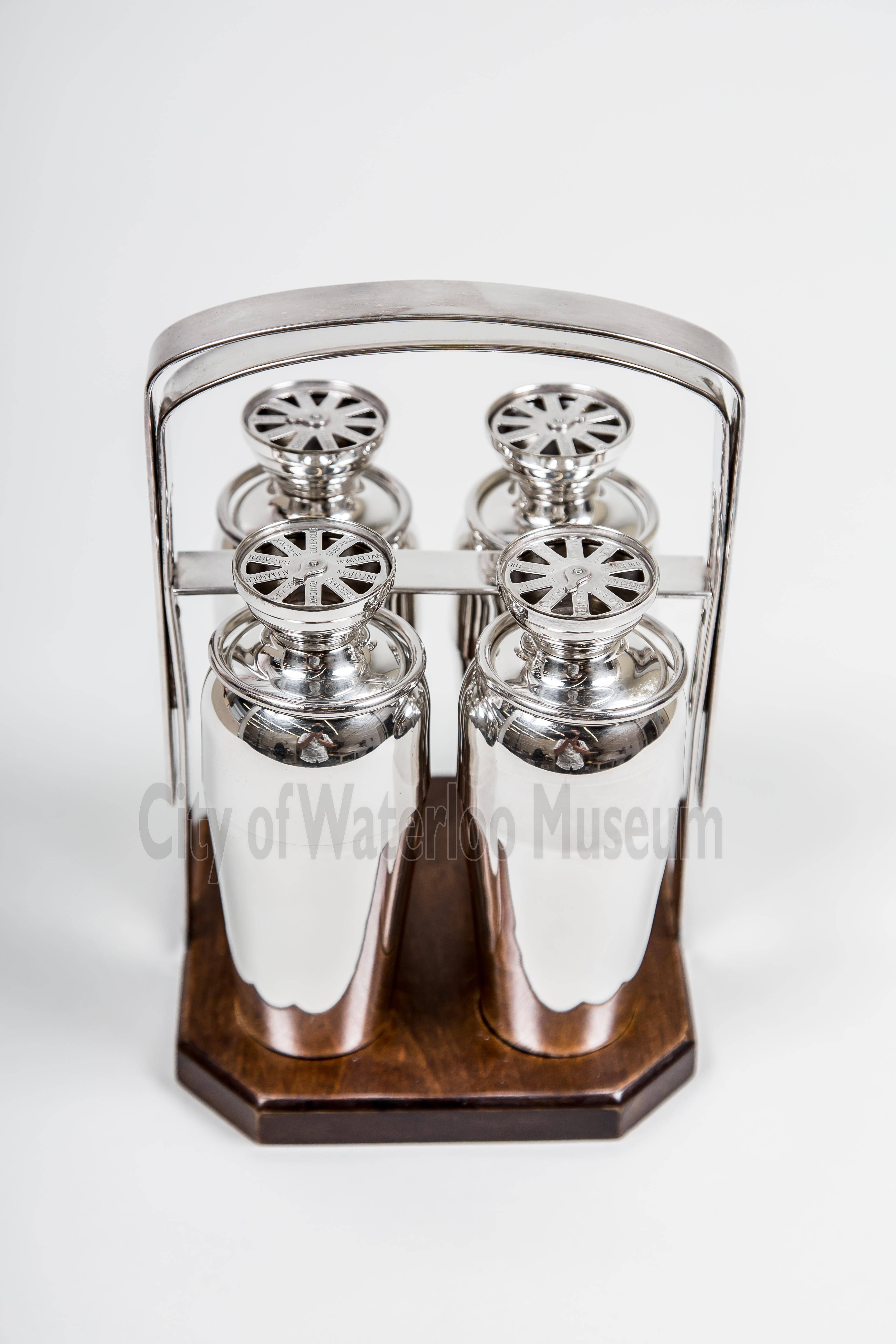 The silver-plated Foursome was one of Saks Fifth Avenue New York's most popular wedding gifts. Made by the Napier Company in Connecticut, this timesaving barware set could shake four individual cocktails at the same time. Dial the indicators on the top to your drink of choice, Manhattan, Martini, and Bronx. Clamp the handle down and shake.