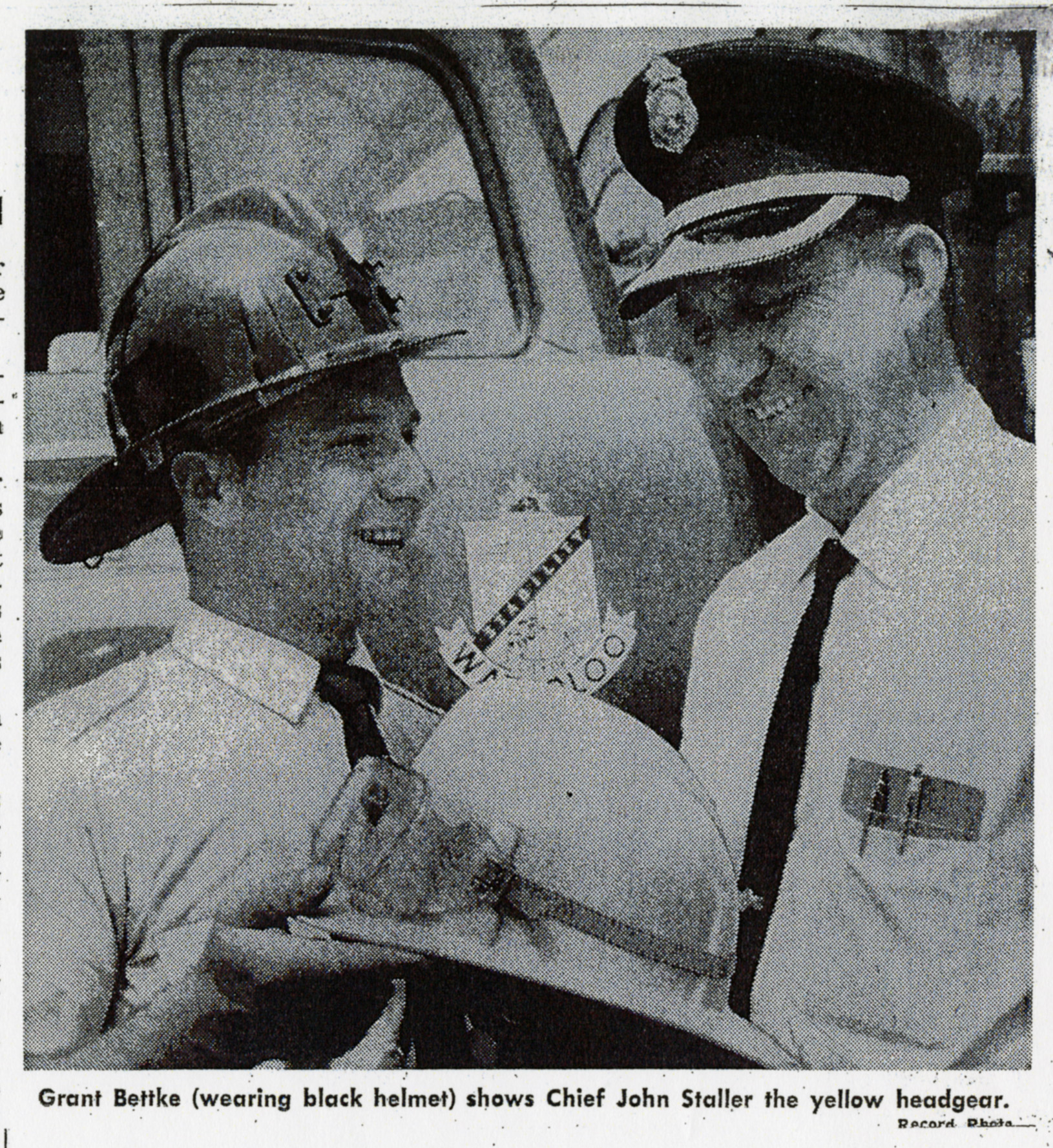 Waterloo firefighters were the first in Canada to wear chrome yellow coloured helmets. Waterloo Fire Chief John Staller initiated the change in 1968. The chrome yellow helmets were easier to see in smoke-filled buildings than the traditional black helmets. The colour change greatly improved the department’s safety record. The newest style includes an ear/neck protector, chinstrap, reflective trim, and a high-heat thermoplastic face shield.