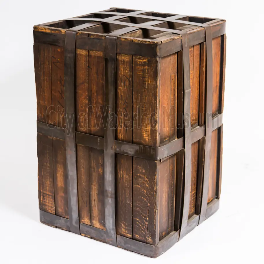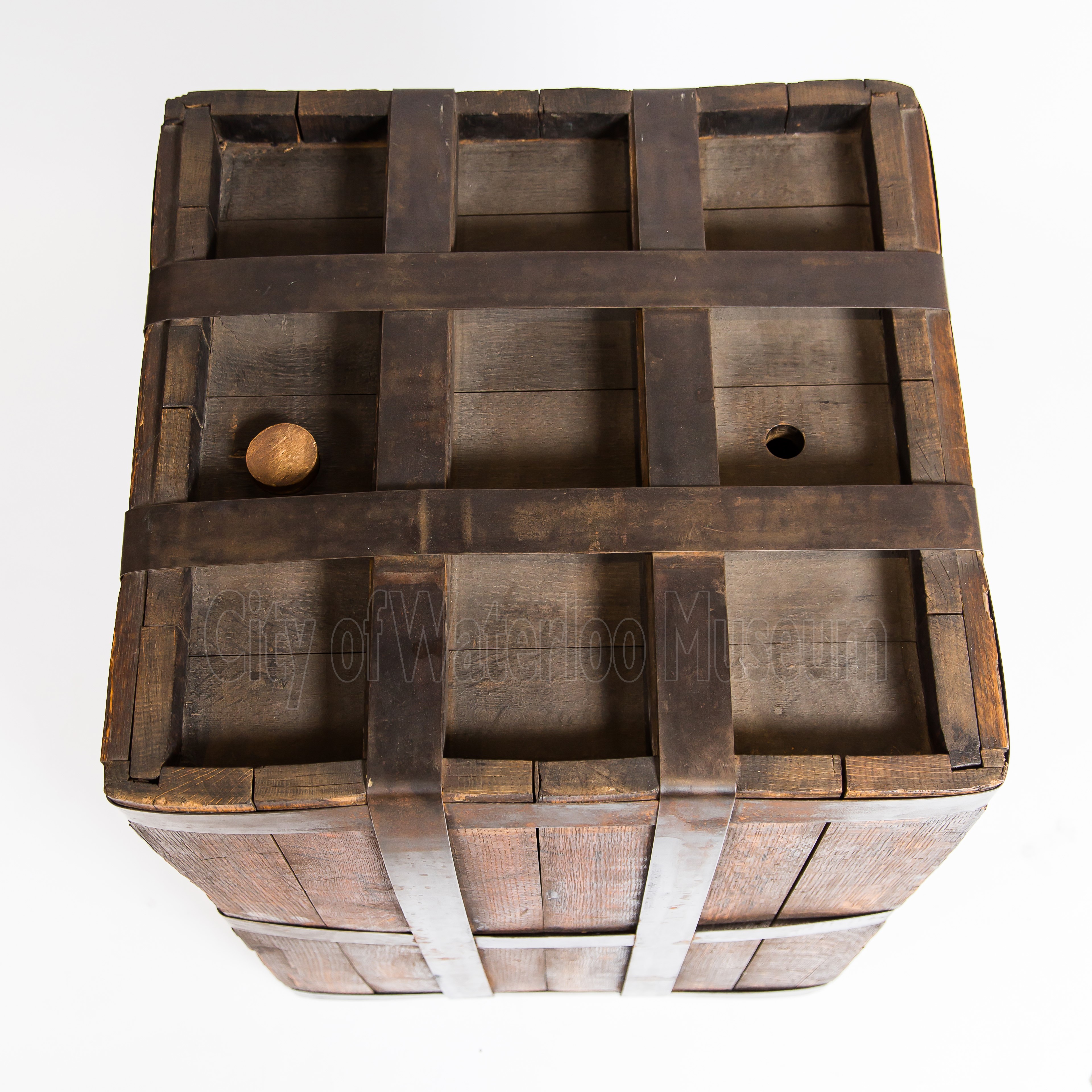 This barrel was officially known as “Experiment M-290” by Seagram Distillers in the 1960s. Arthur Downey, head of research at Distillers Corporation in Montreal, commissioned Waterloo’s Canada Barrels and Kegs Limited to make the world’s first square oak whisky barrel. Why might you ask? It seems someone had the idea that the shape of the barrel might improve the flavour of the whisky and speed up the maturation process. To test this theory, a standard round barrel and the square barrel were both filled with whisky and left to mature side-by-side. Five years later, the experiment determined there was no difference. The experiment was not considered a failure even though the square barrel was not watertight, tough to move, costly and difficult to build. M-290 was the first and only square barrel made.