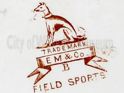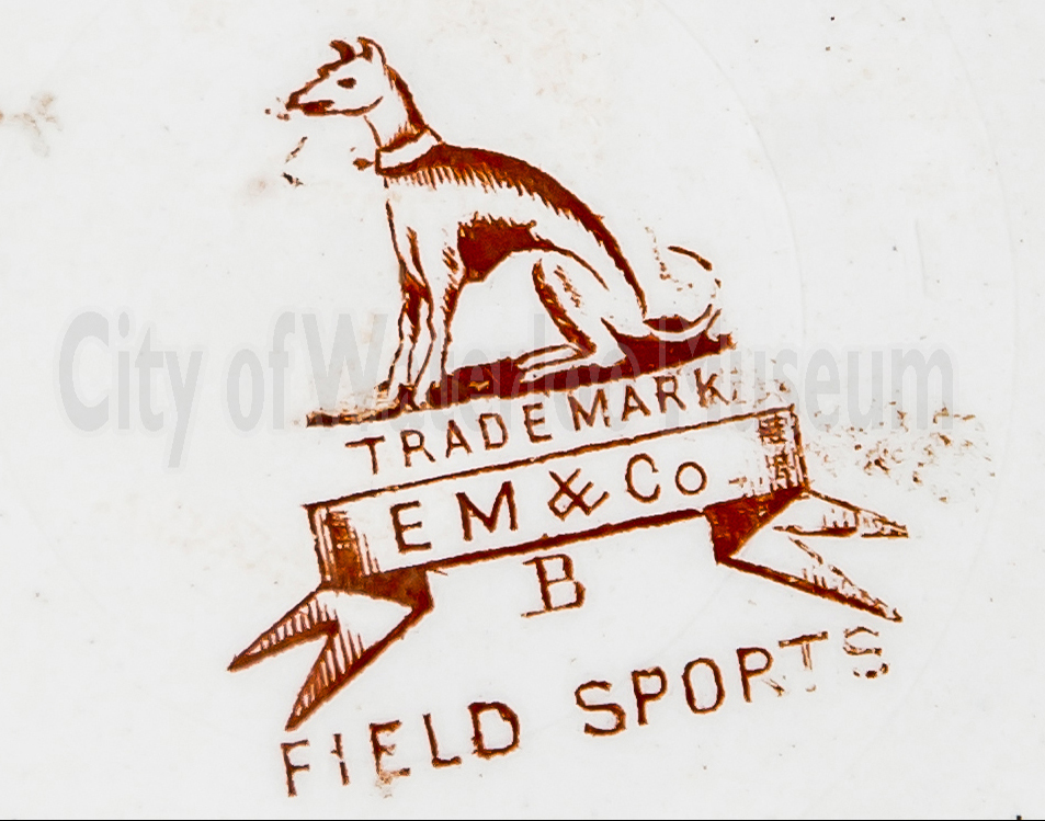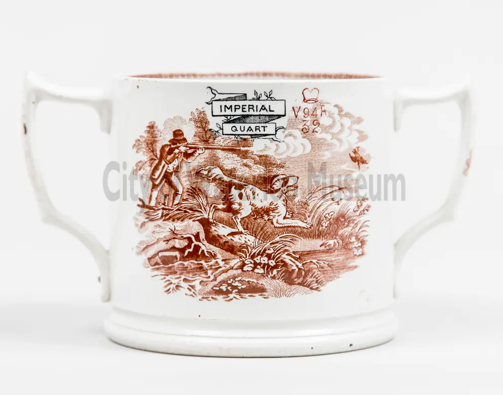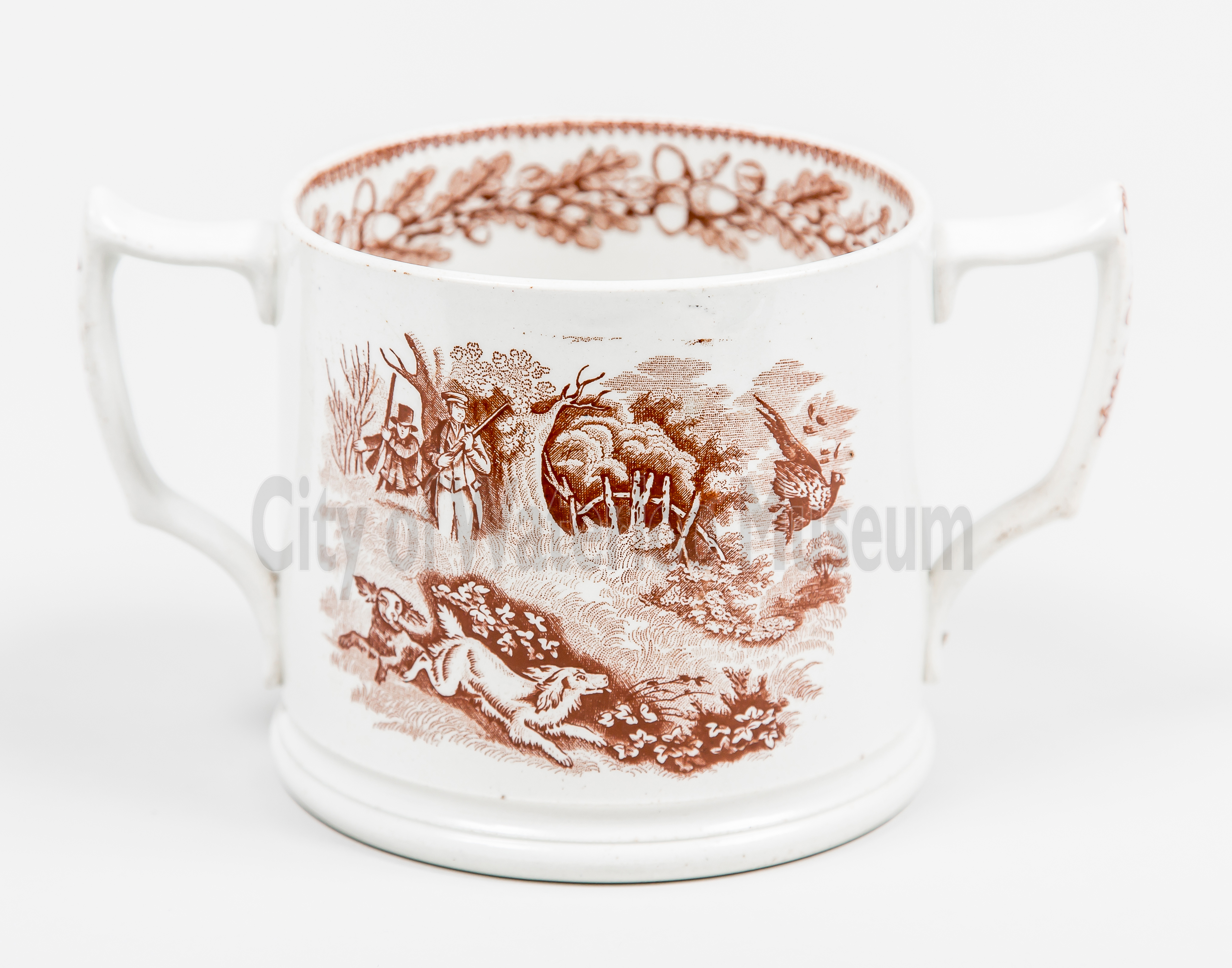This two-handled porcelain cup tells the tale of a pheasant hunt. On one side, two men follow a dog chasing a flying pheasant. The other side shows a hunter firing at the pheasant and the dog running to retrieve the prize. An oak leaf and acorn transfer print decoration runs along the handles and interior rim. The loving cup was made by EM and Co. of England.