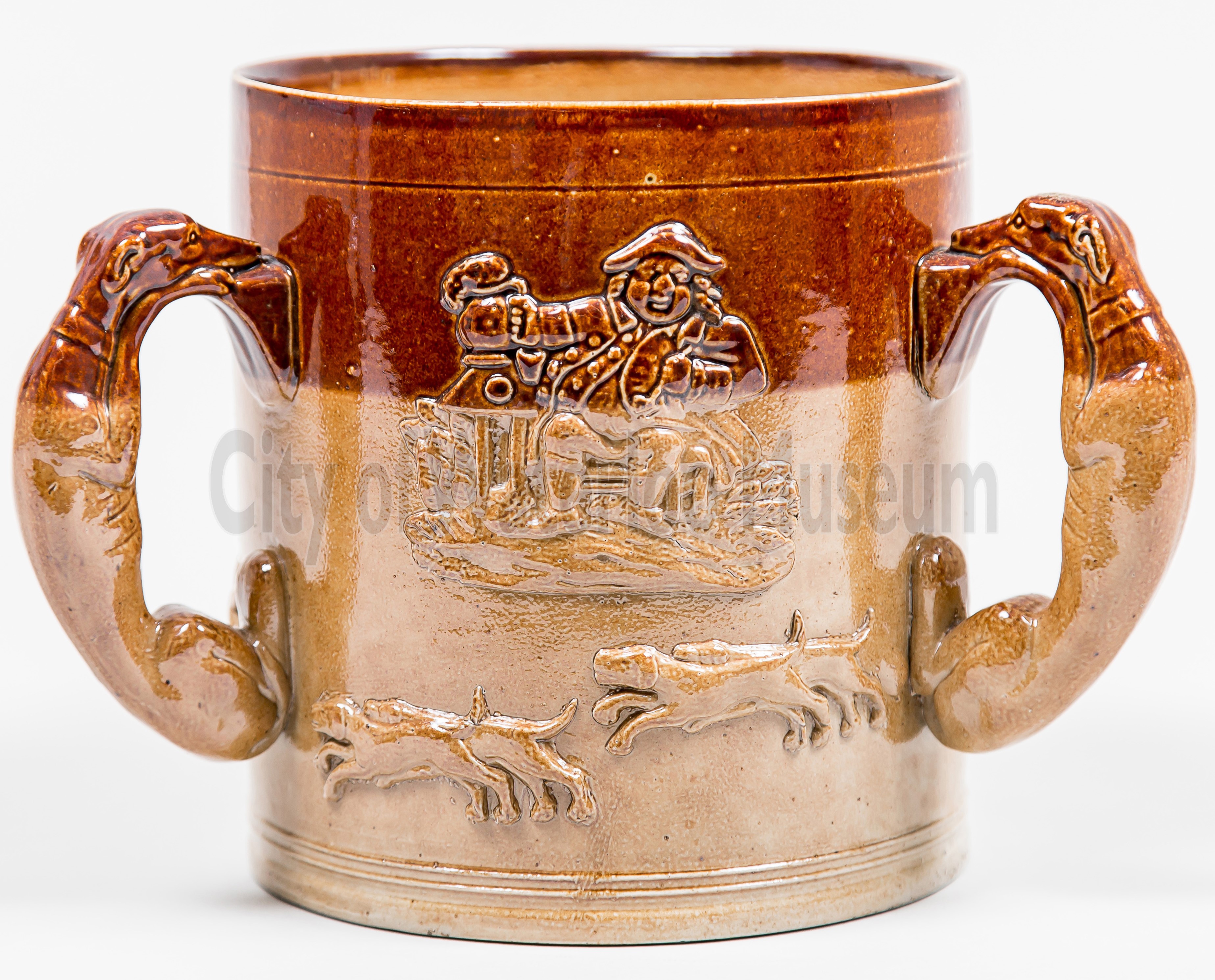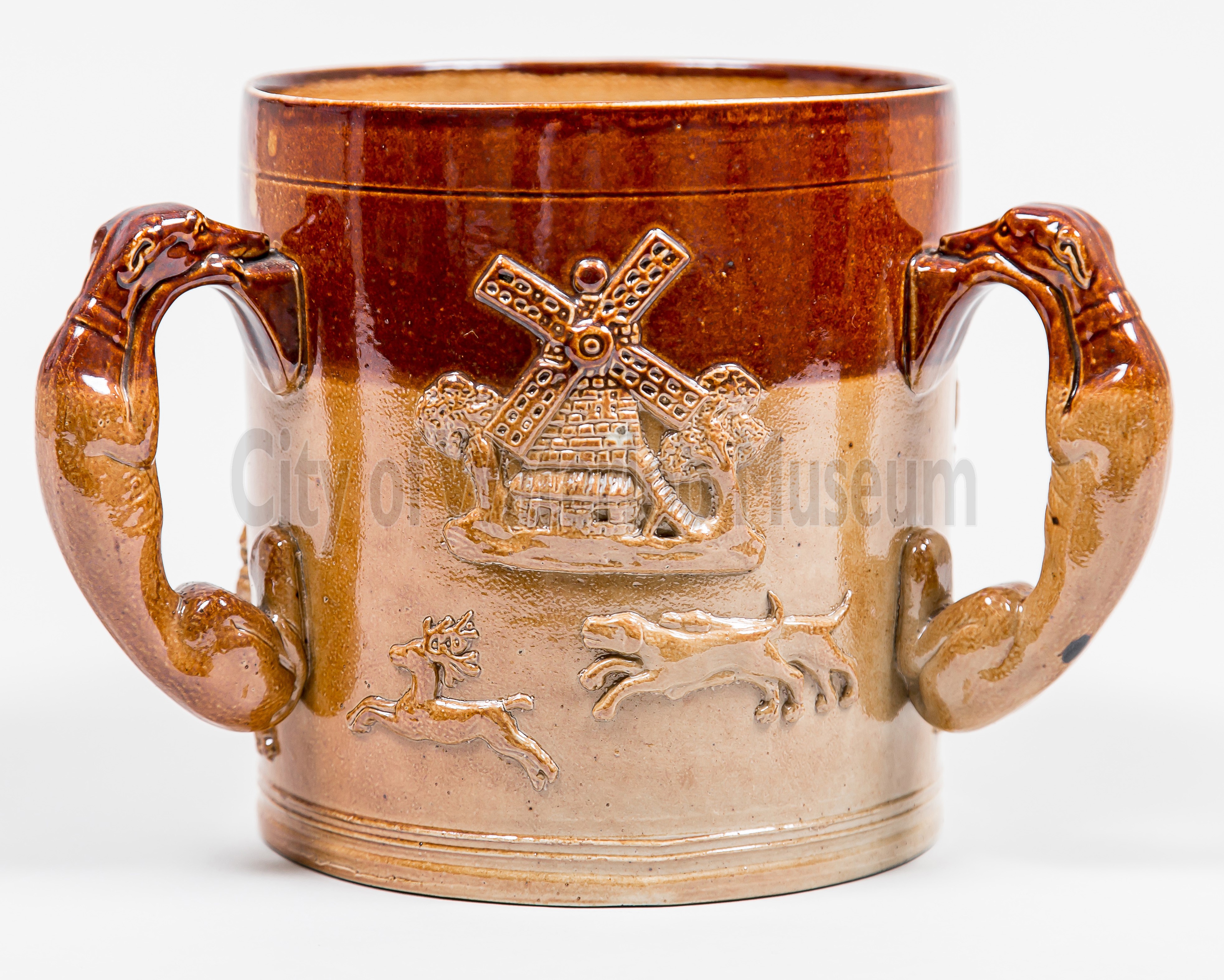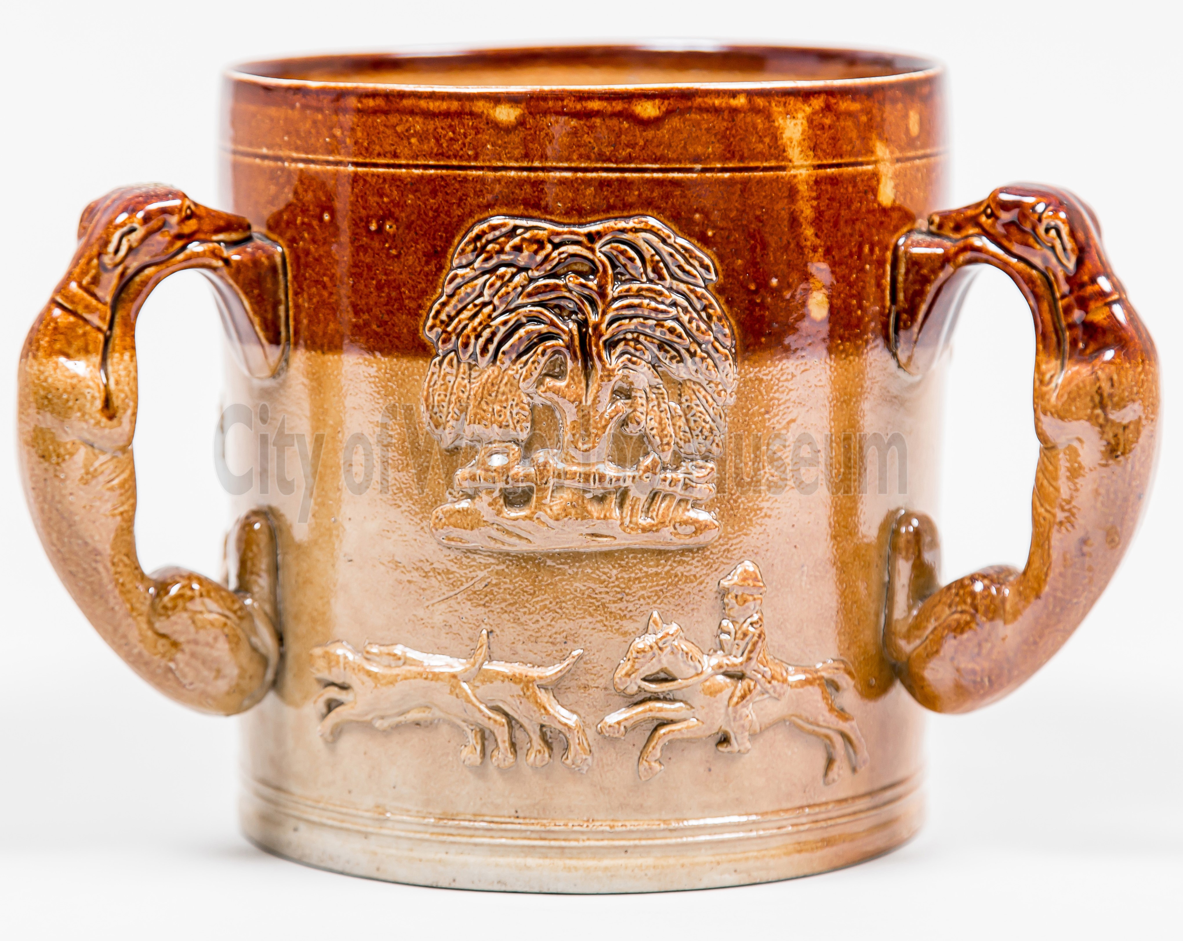 This three-handled stoneware cup is covered with moulded and applied decorations. Circling the bottom of the cup is a hunt scene. A man on horseback and his hunting dogs chase a fleeing deer. Above are three scenes; a windmill, a willow tree, and a man seated at a table drinking. The handles are mould-made in the shape of running dogs. The tan and brown loving cup was made by Royal Doulton of England.