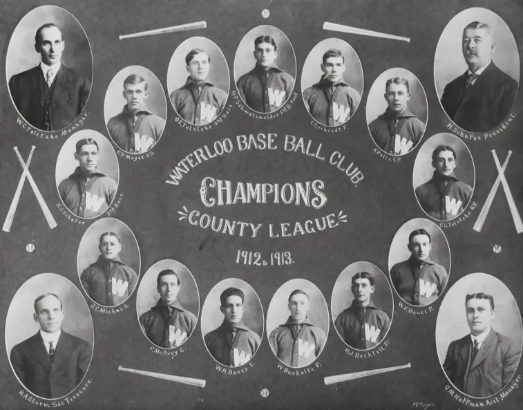 The 1912–1913 Waterloo County Baseball Club played in a four-team league with Berlin (Kitchener), Hespeler, and Galt. Waterloo opened the season with a big 14–10 win in Galt on May 31, with the mayor throwing the first pitch and a parade after the game. Their first home game against rivals from Berlin on June 7 ended in a 6–4 loss, but by mid-July Waterloo was leading the league. The team won the county championship in Berlin on August 9 and finished the season strong by winning their final game on August 25, taking the county league title for the second year in a row with a record of nine wins and three losses.