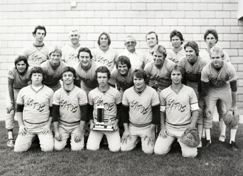 Back Row: Dan Collison, Nelson Grigg Sr. (Coach), Mark Gryba, M. (Champ) Glassford (Manager), Jim Taylor, Larry Crooke, Bill Scharlach