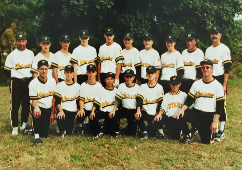 Front Row: Coach Tim Gowland, Mike Wahl, Jason Bossenberry, Geoff Takasaki, Mike Andrulis, Craig Melcher, Batboy T. J. Auer, Manager Mike Moogk
