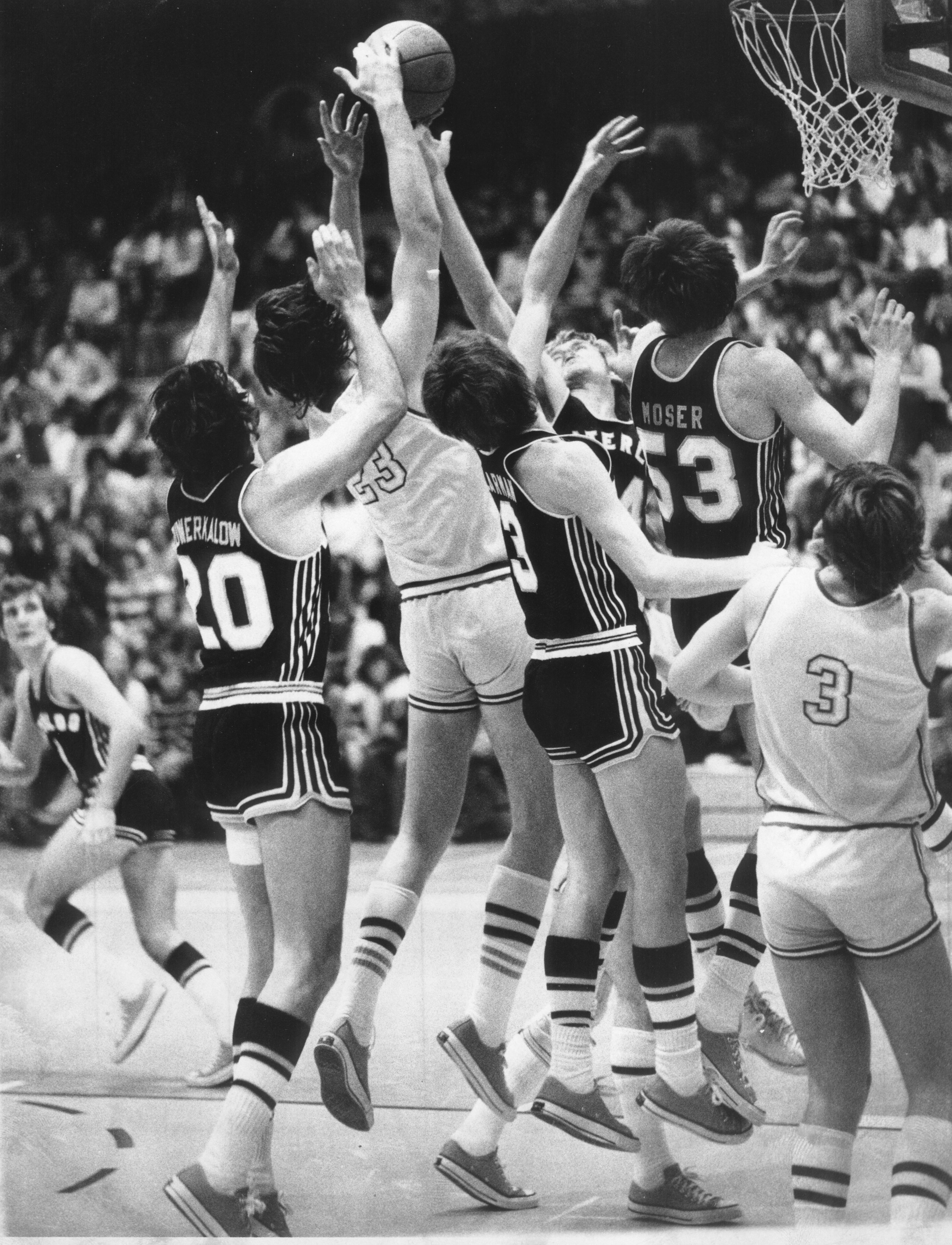 Back row left to right, Steven Cole, mgr., Jeff Scott, Bill Robinson, Don Larman, Charles Chambers, Ed Talaj, Don McCrae, coach.