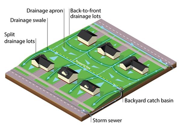 Subdivision grading plans are designed by engineers and approved by the city to make sure water drains safely across neighbourhoods.